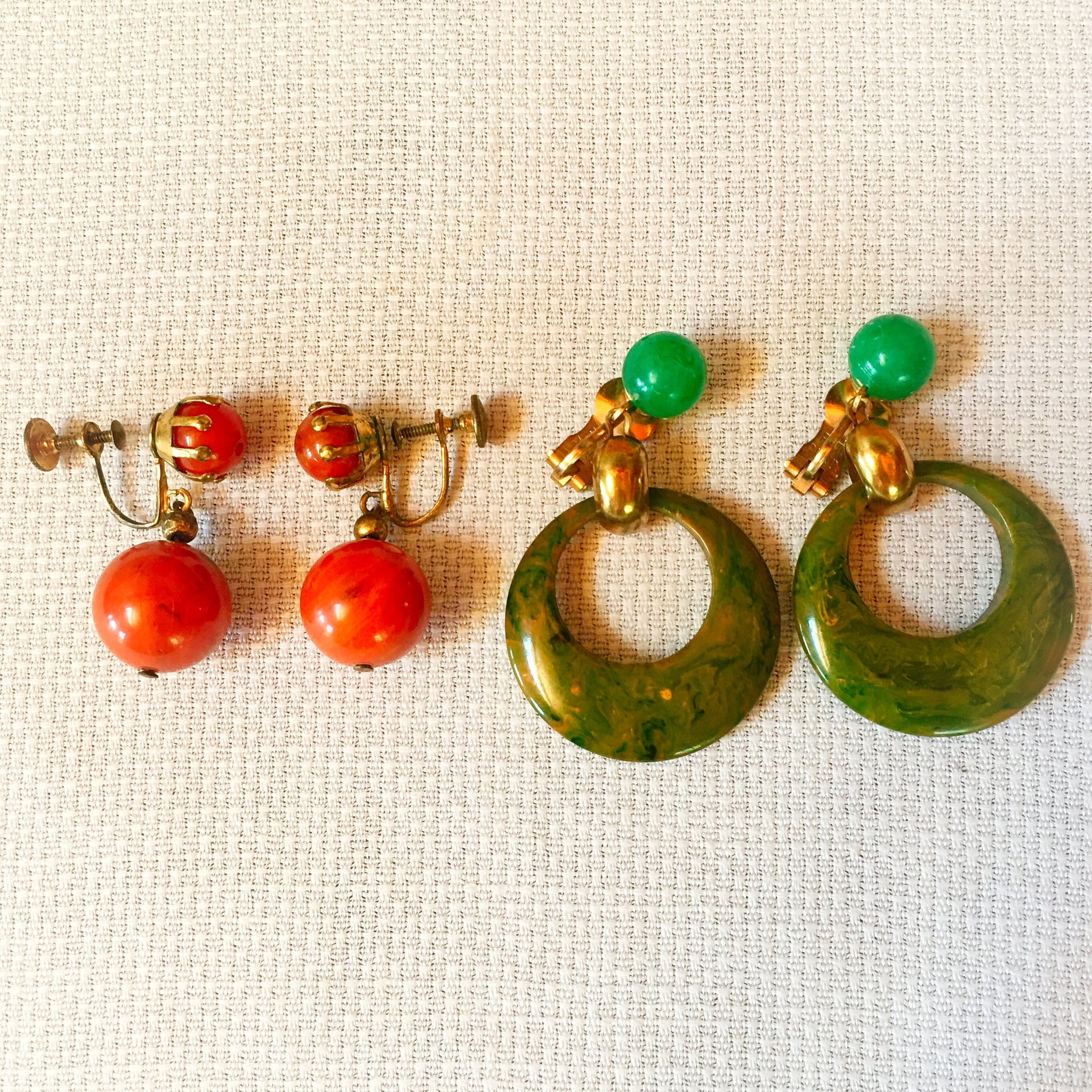 1930s - 1940s Bakelite Clip-On Earrings: Green Hoop & Orange Marbled Screwback Pair