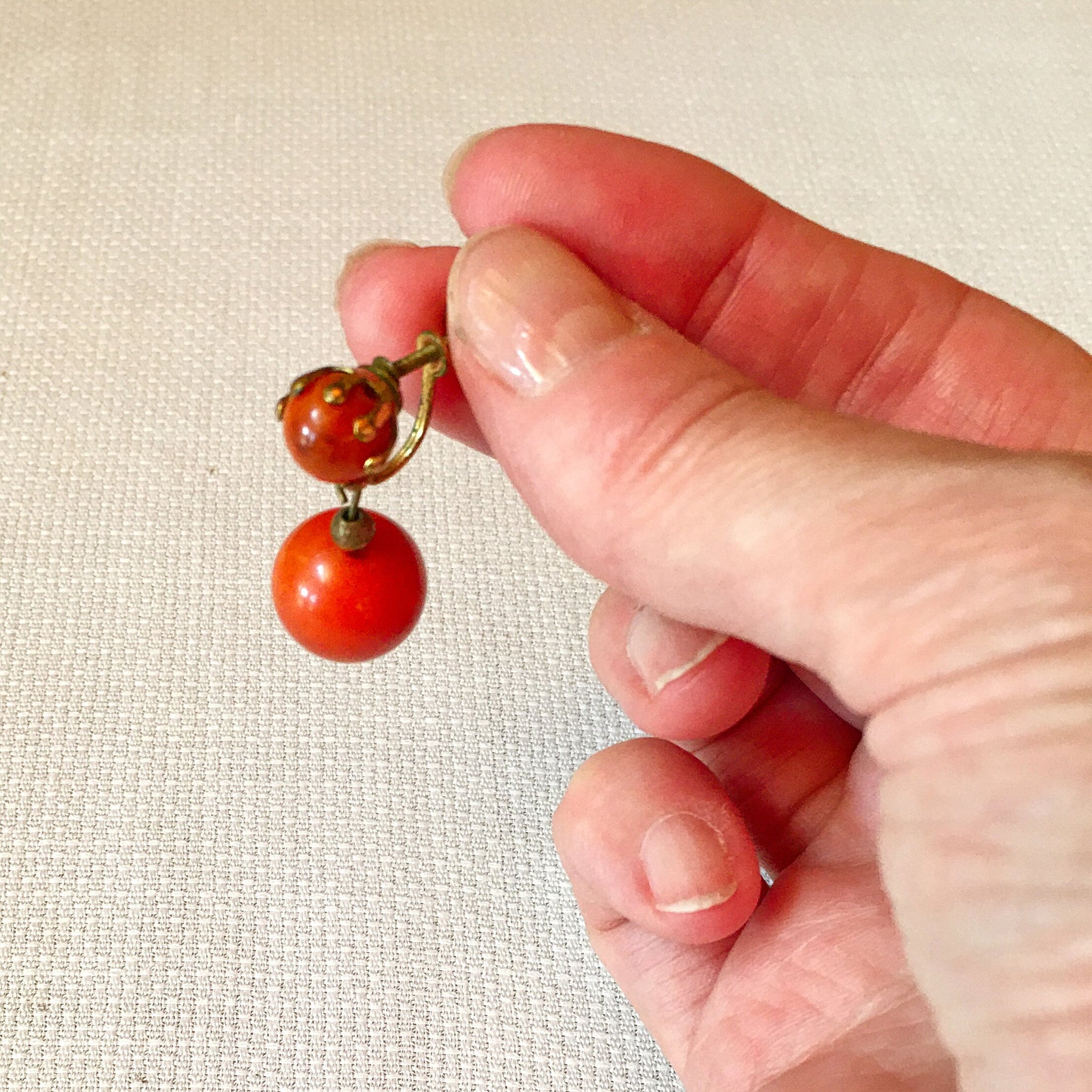 Vintage 1930s - 1940s Bakelite earrings with rich marbled color and classic Art Deco style. This lot includes two pairs: one pair green hoops with clip-on clasps marked “Pat. Pend.” and one in bold orange round beads with screwbacks. Both sets feature a beautiful, marbleized finish typical of Bakelite jewelry from this era. Clasps are in good working condition.