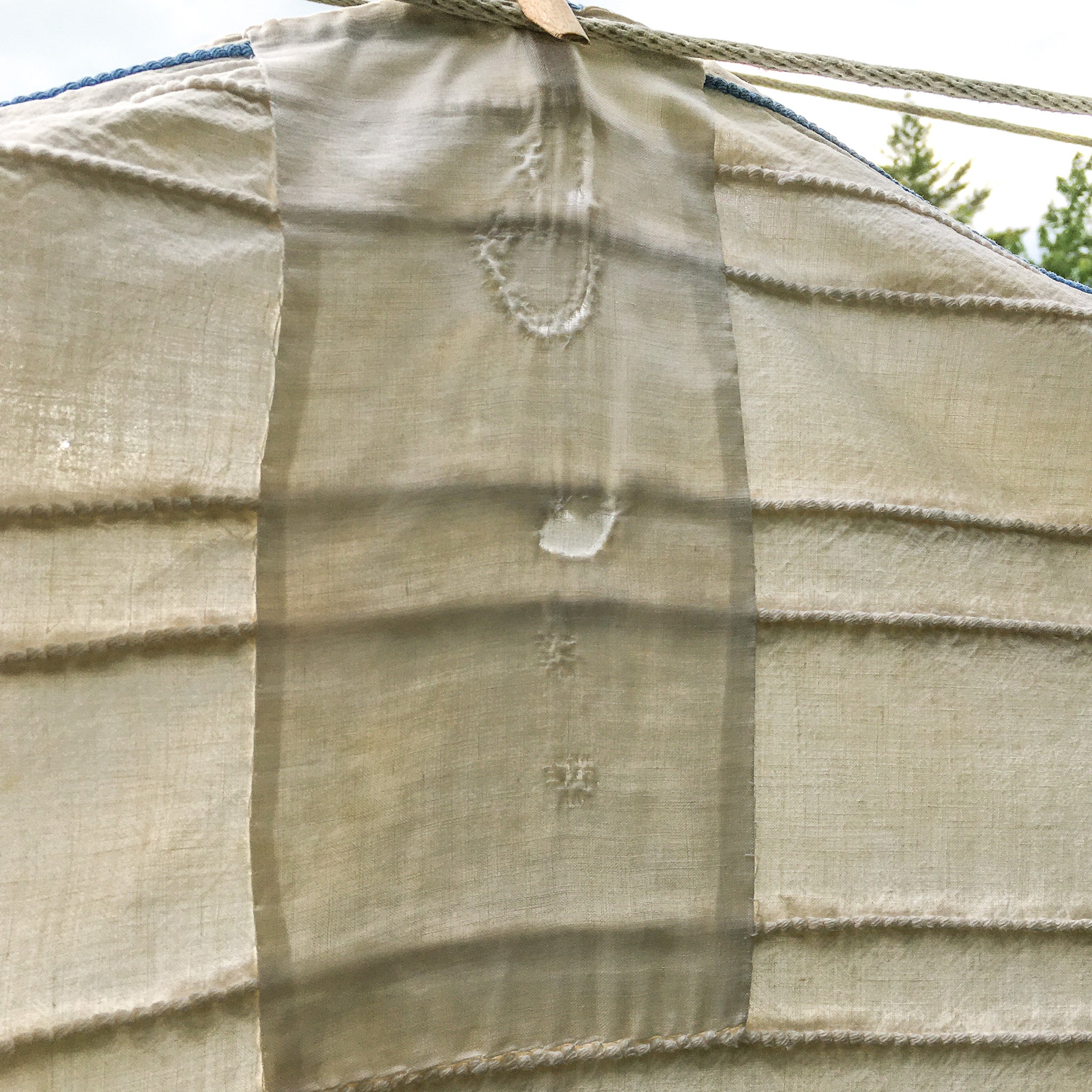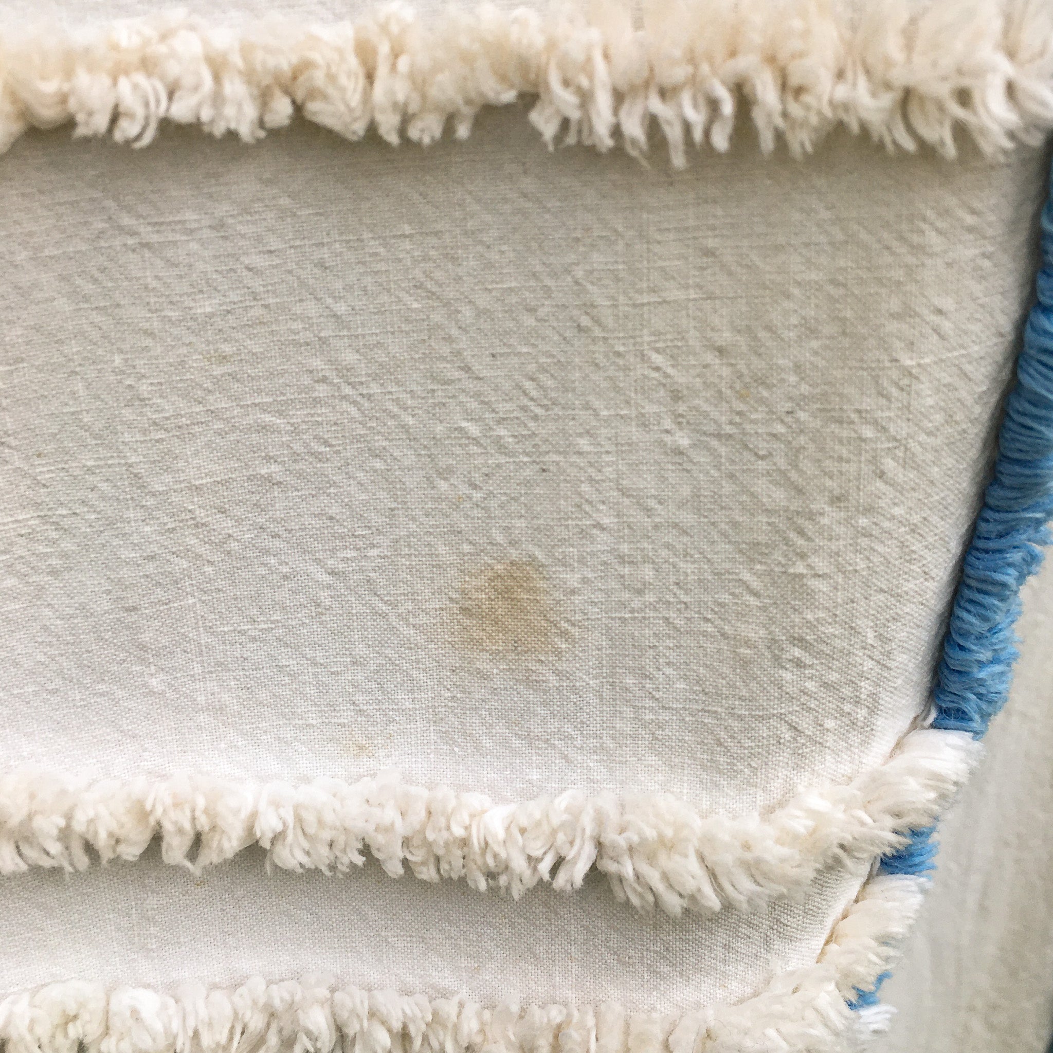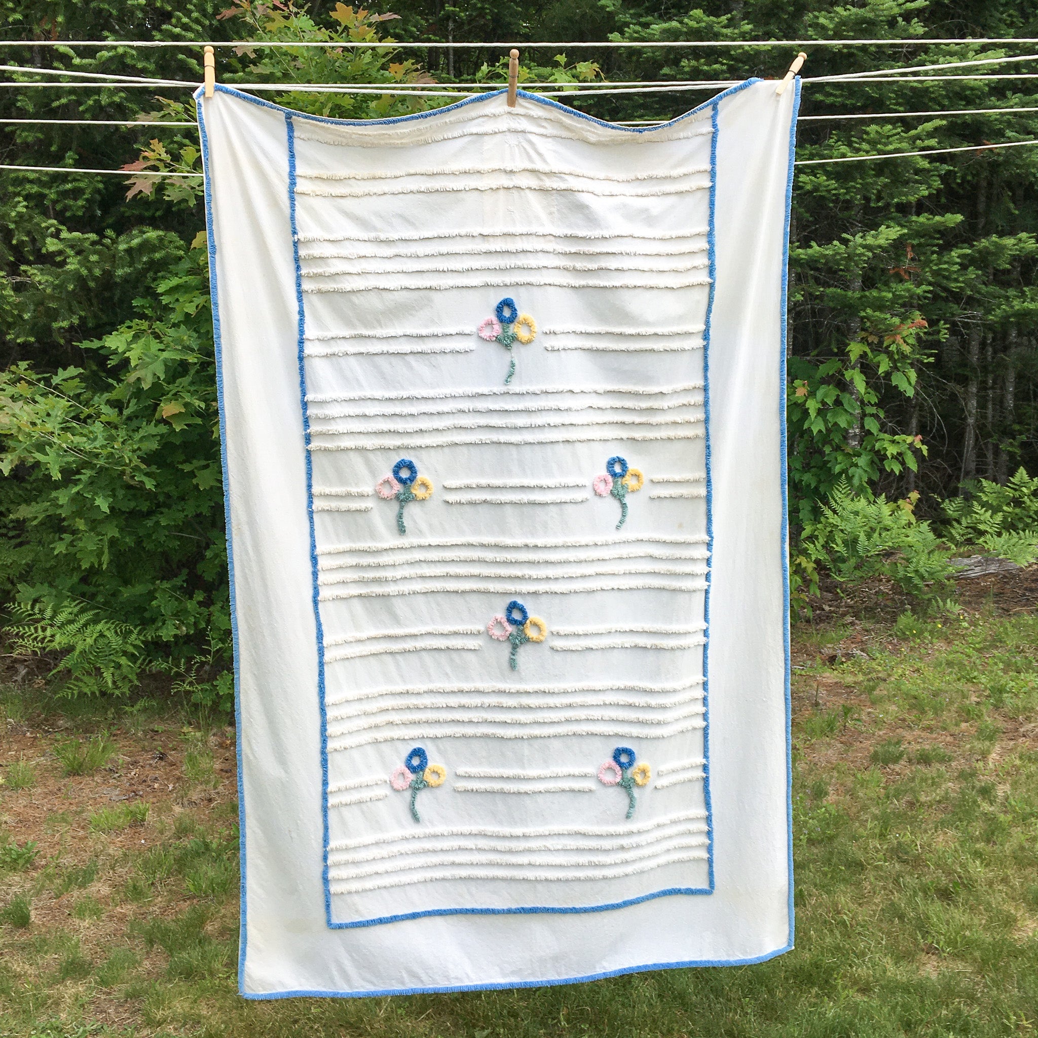 • 1940s Chenille Bedspread – Cotton spread with tufted pastel flowers in pink, blue, yellow, and green. Measures about 40" x 60". One flower has missing tufting, plus a few small spots and a mend (as shown).