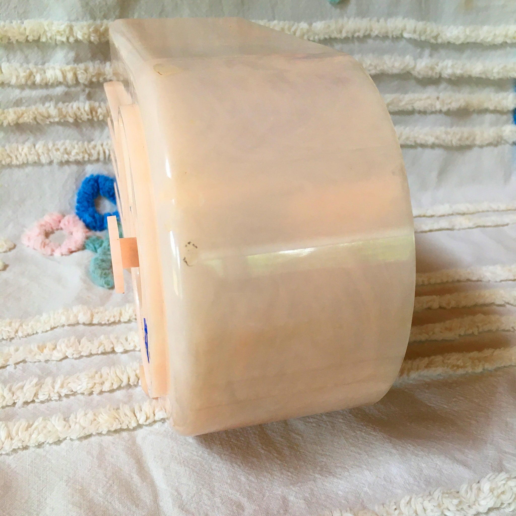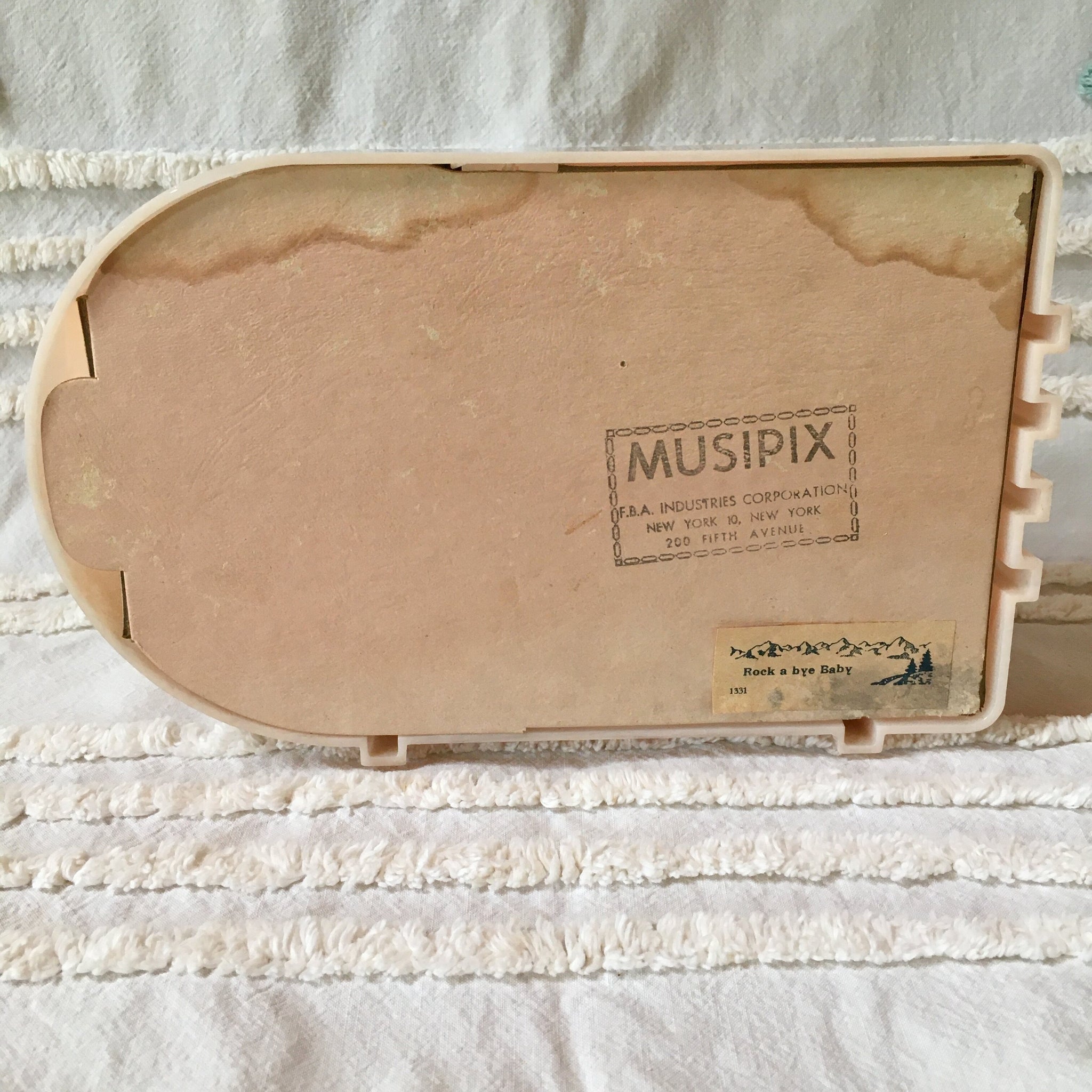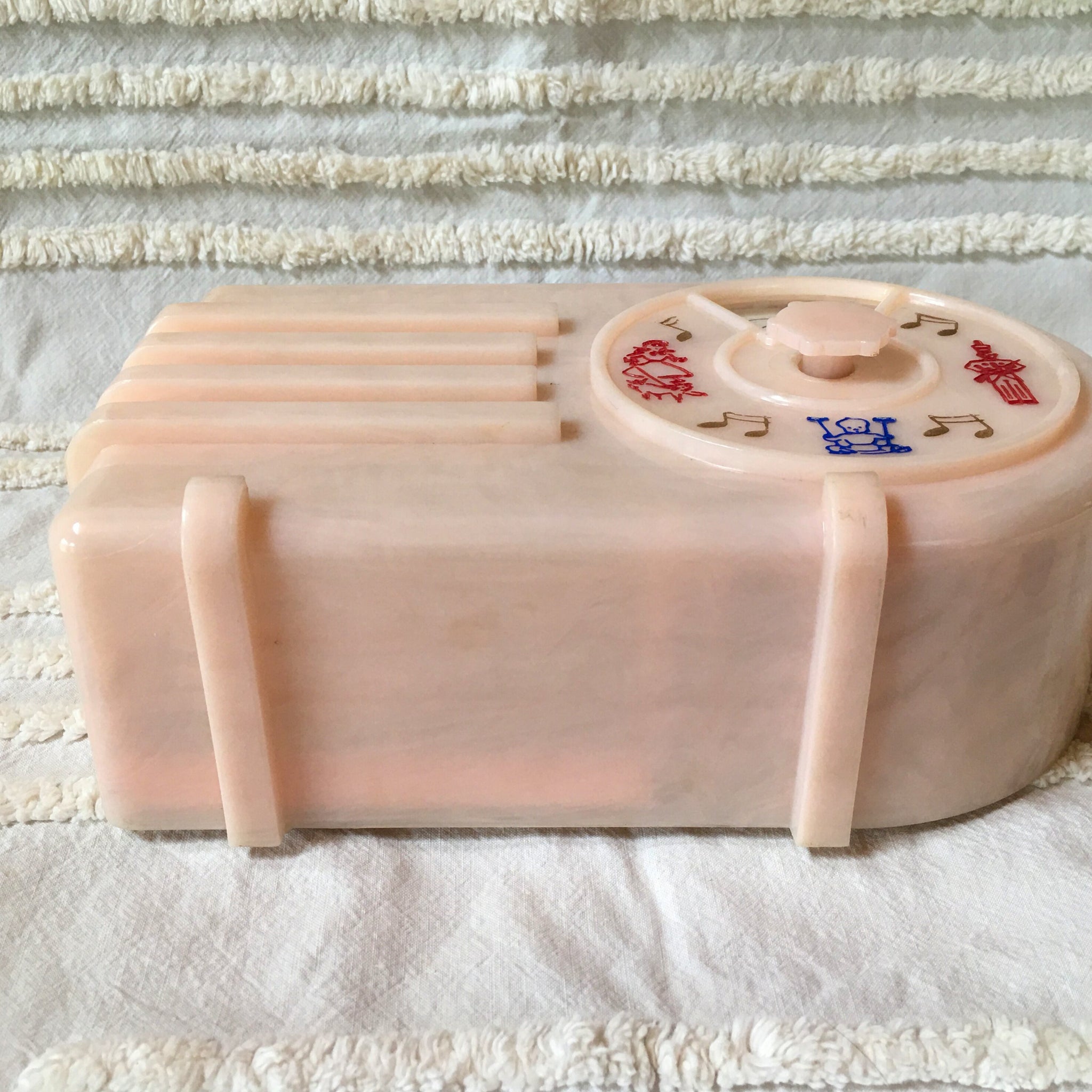 • Nursery Music Box Radio – Pale pink Bakelite or Lucite radio-style music box, marked Musipix. Plays “Rock-a-Bye Baby.” Measures 5.5" tall, 9" wide, 3" deep. Has a chip on top, edge wear, and watermarks on cardboard backing (see photos).  This doesn't play the whole tune but does work and hasn't been overwound - unusual for a music box of this age!