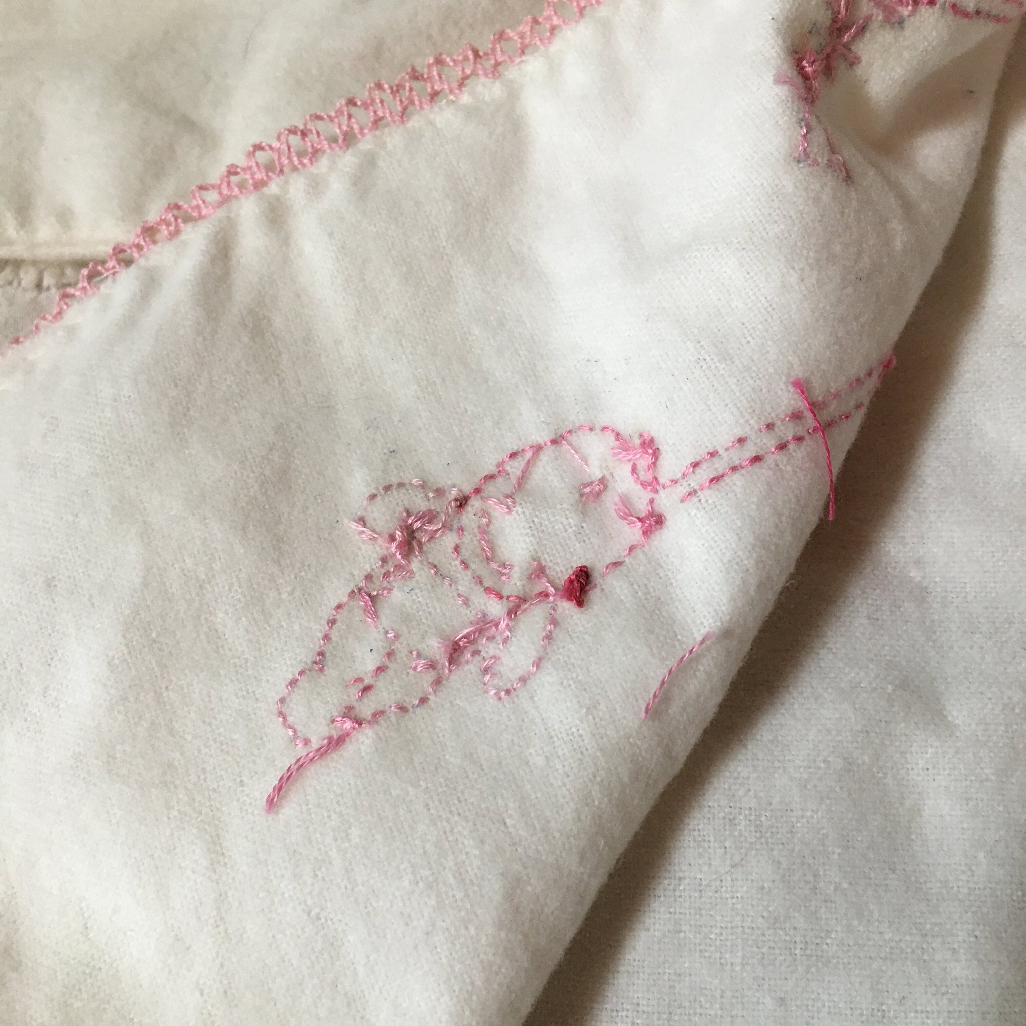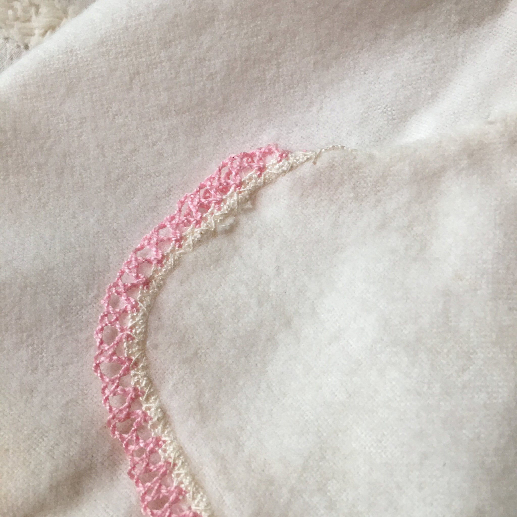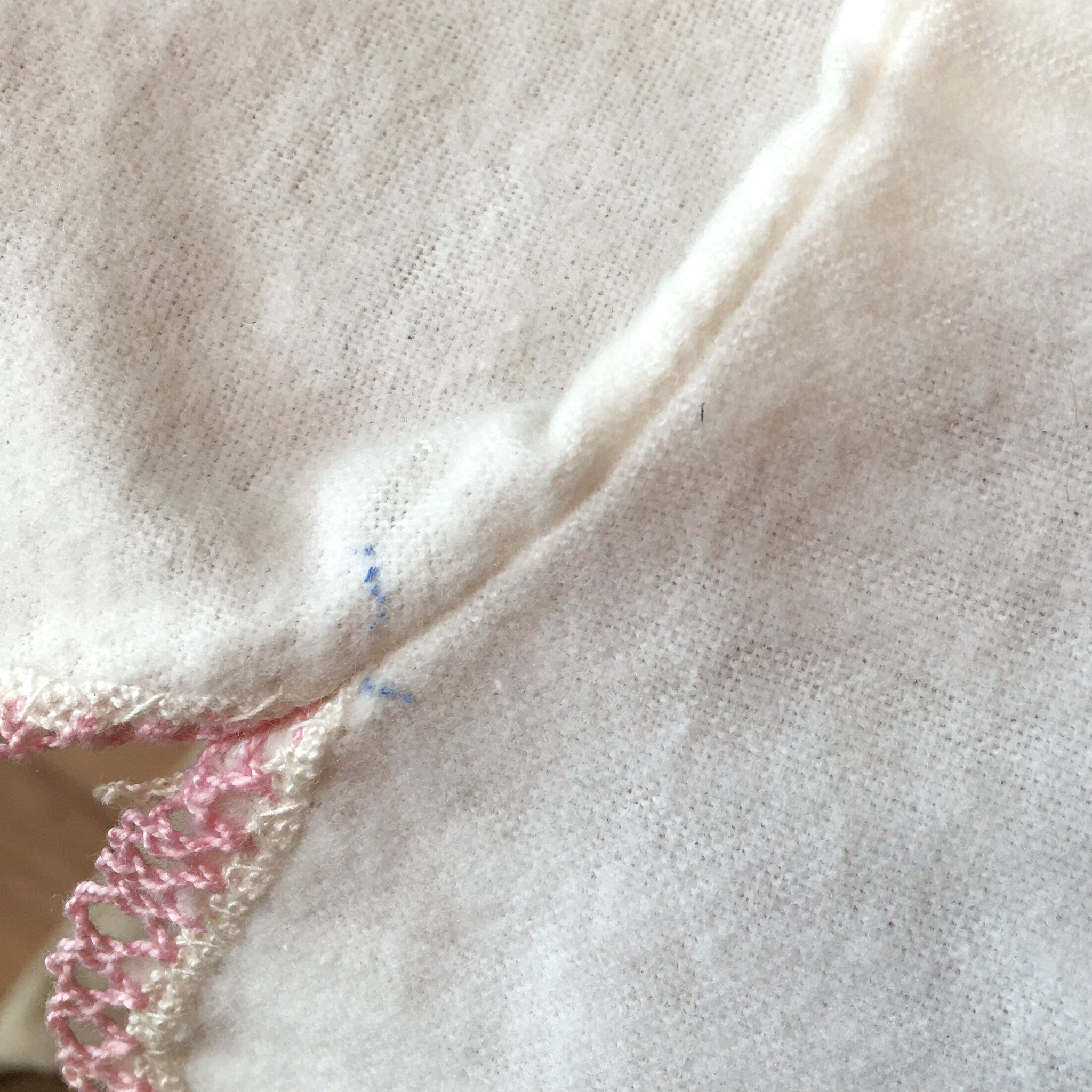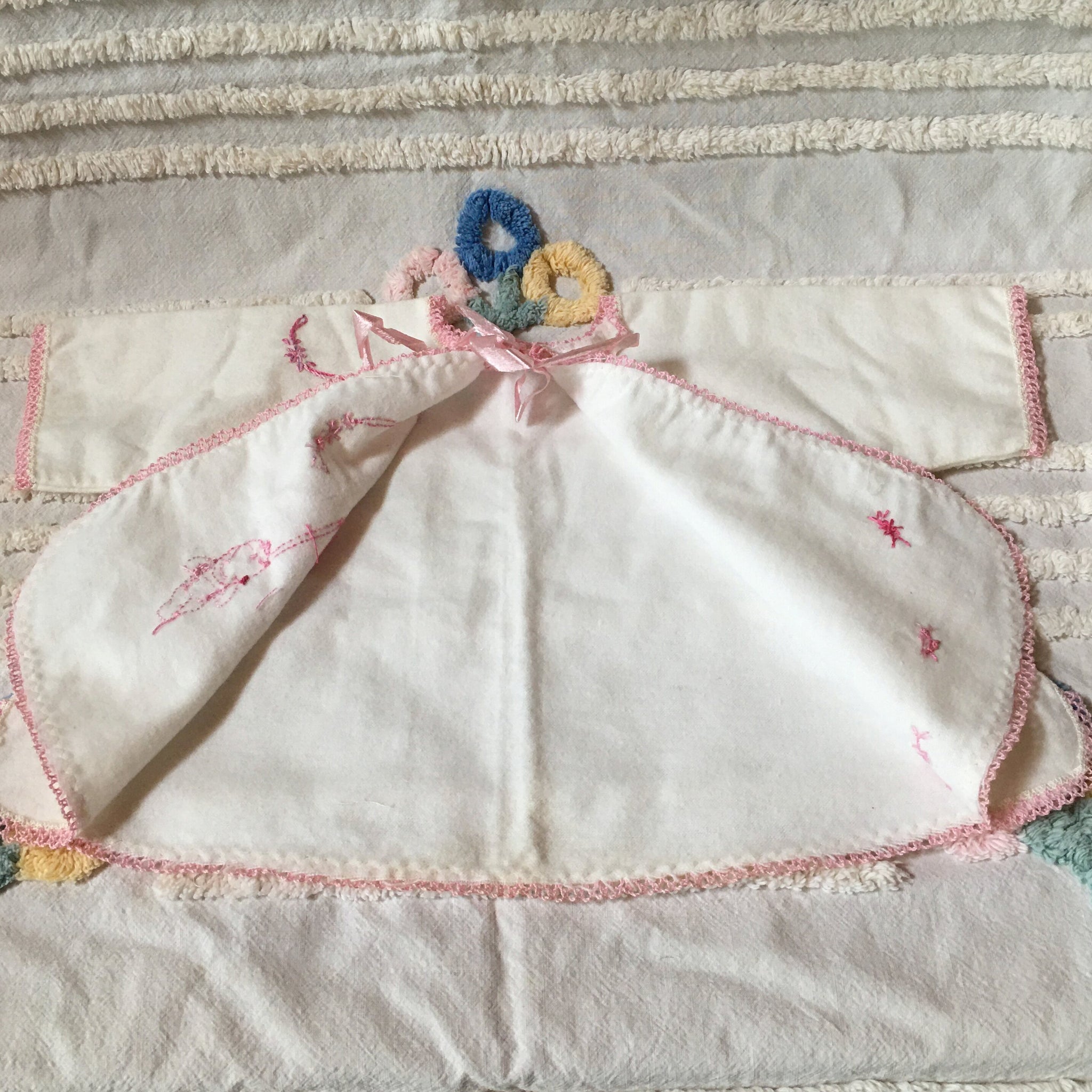 • Handmade Baby Jacket – White flannel with pink embroidery, crocheted trim, and satin ribbon ties. Likely unused; stored for many years. Two faint blue hand-sewing marks at seam. Measures 11" shoulder to hem, 12.5" across chest, sleeves 2.5". Excellent condition and super soft!