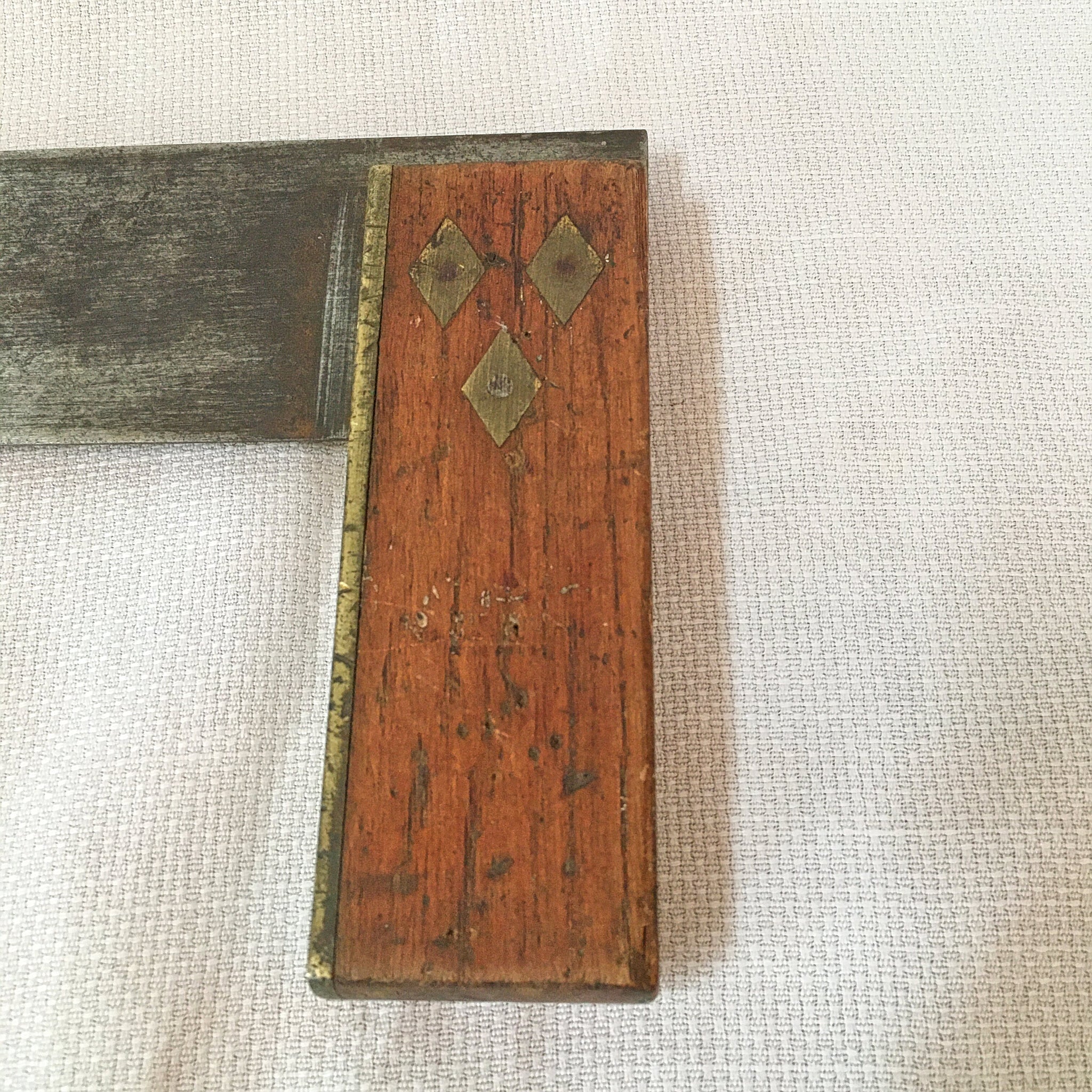 Antique woodworking tools including a square and an adjustable scribe (marking gauge), both with brass accents. The square has a 6" steel blade and a 4.75" wooden handle. It is in very good condition with a small amount of light surface rust on the blade and one dark spot on the handle, shown in photos. Blade remains straight and solid.