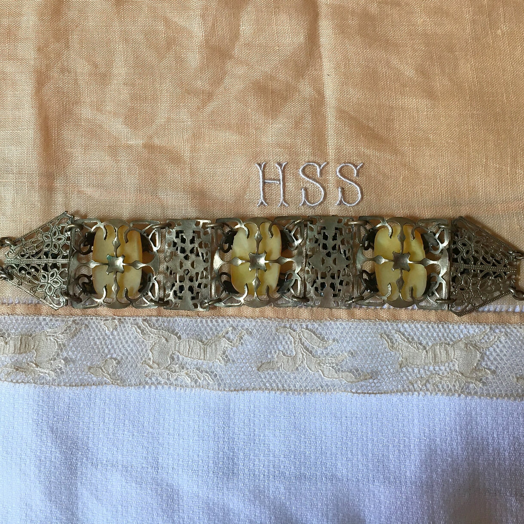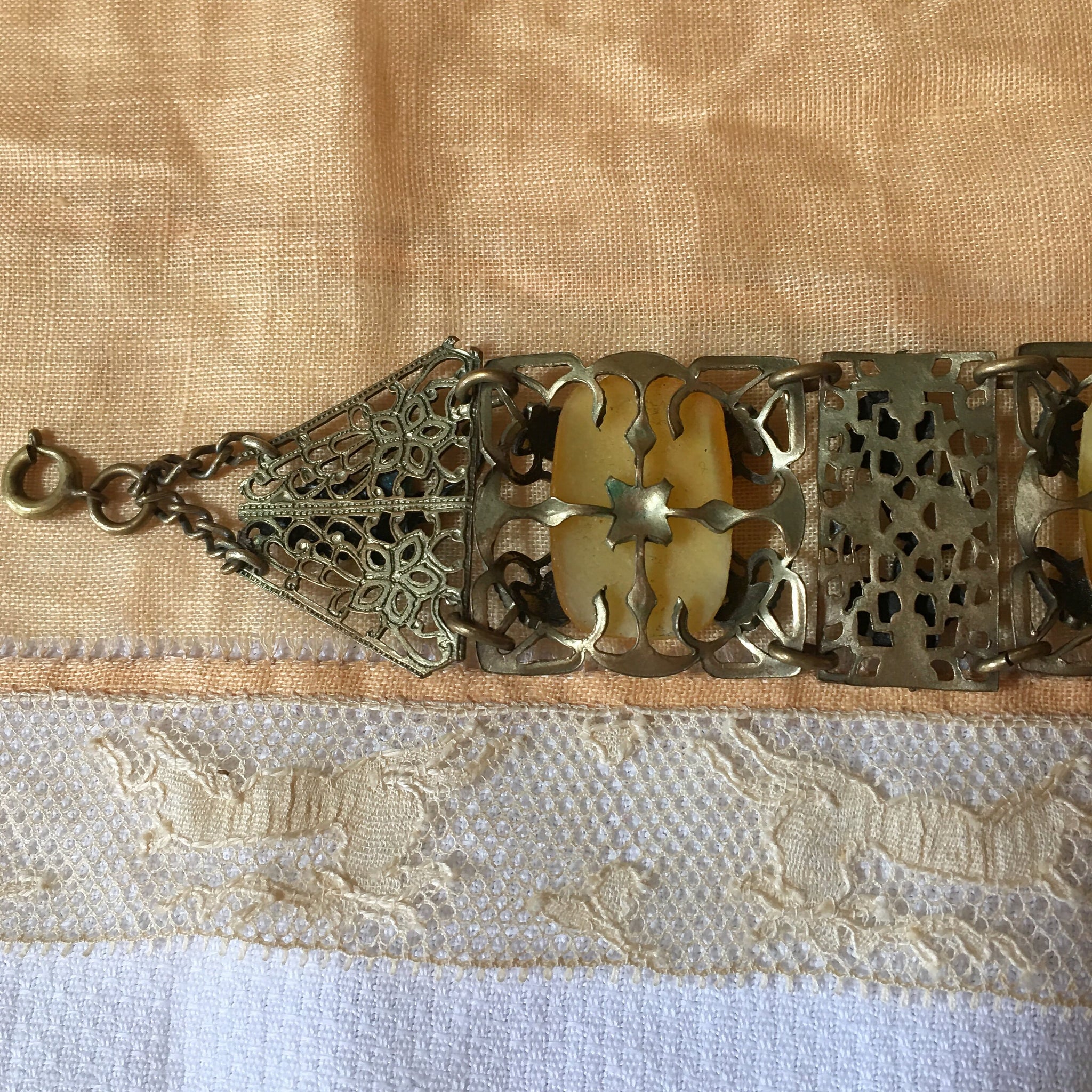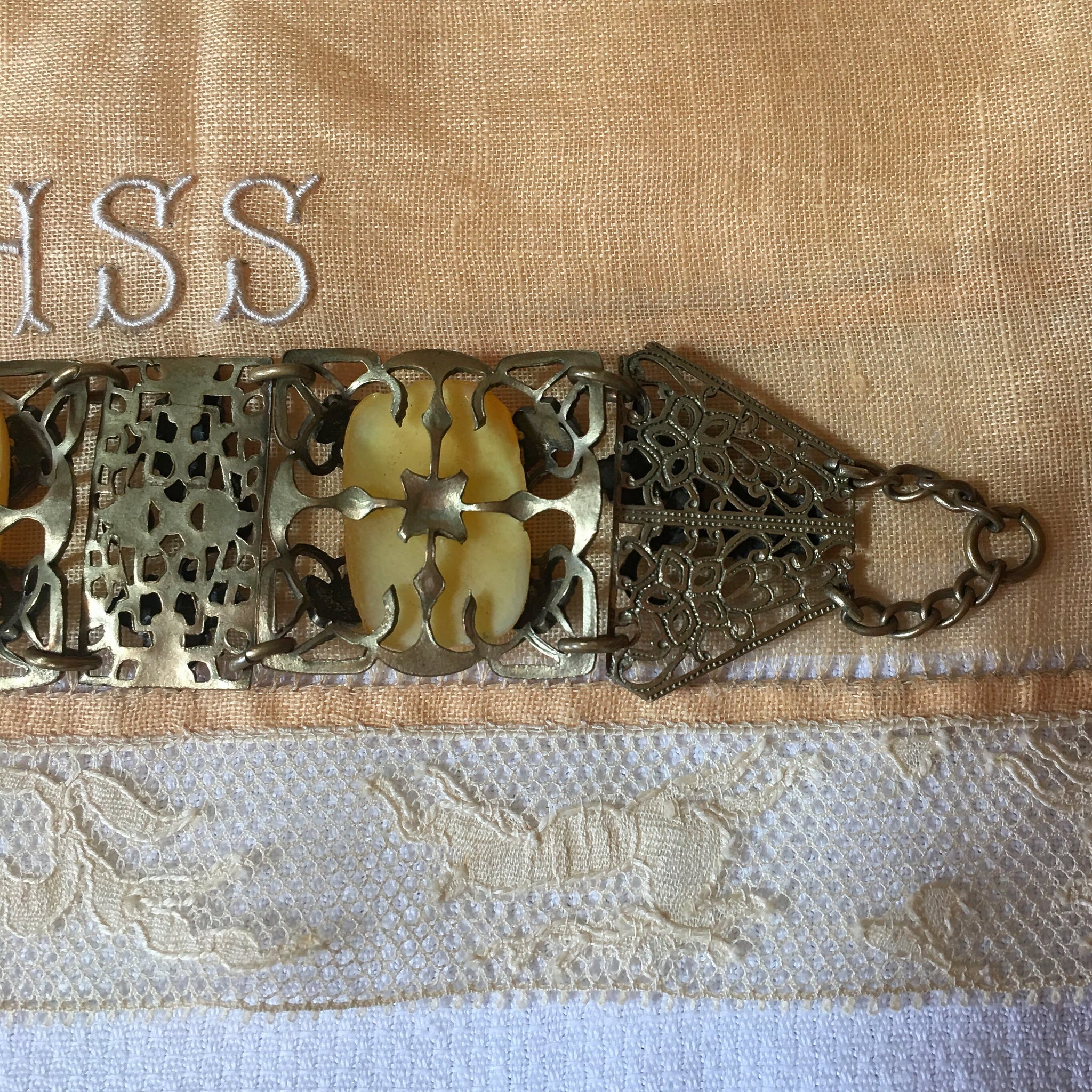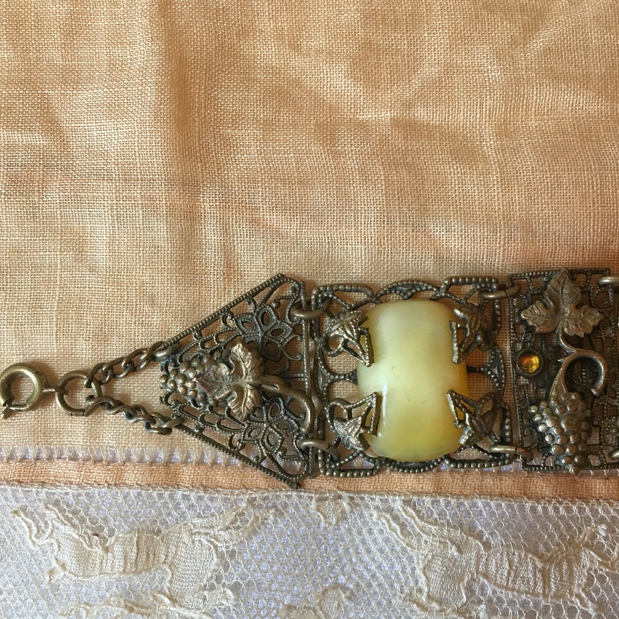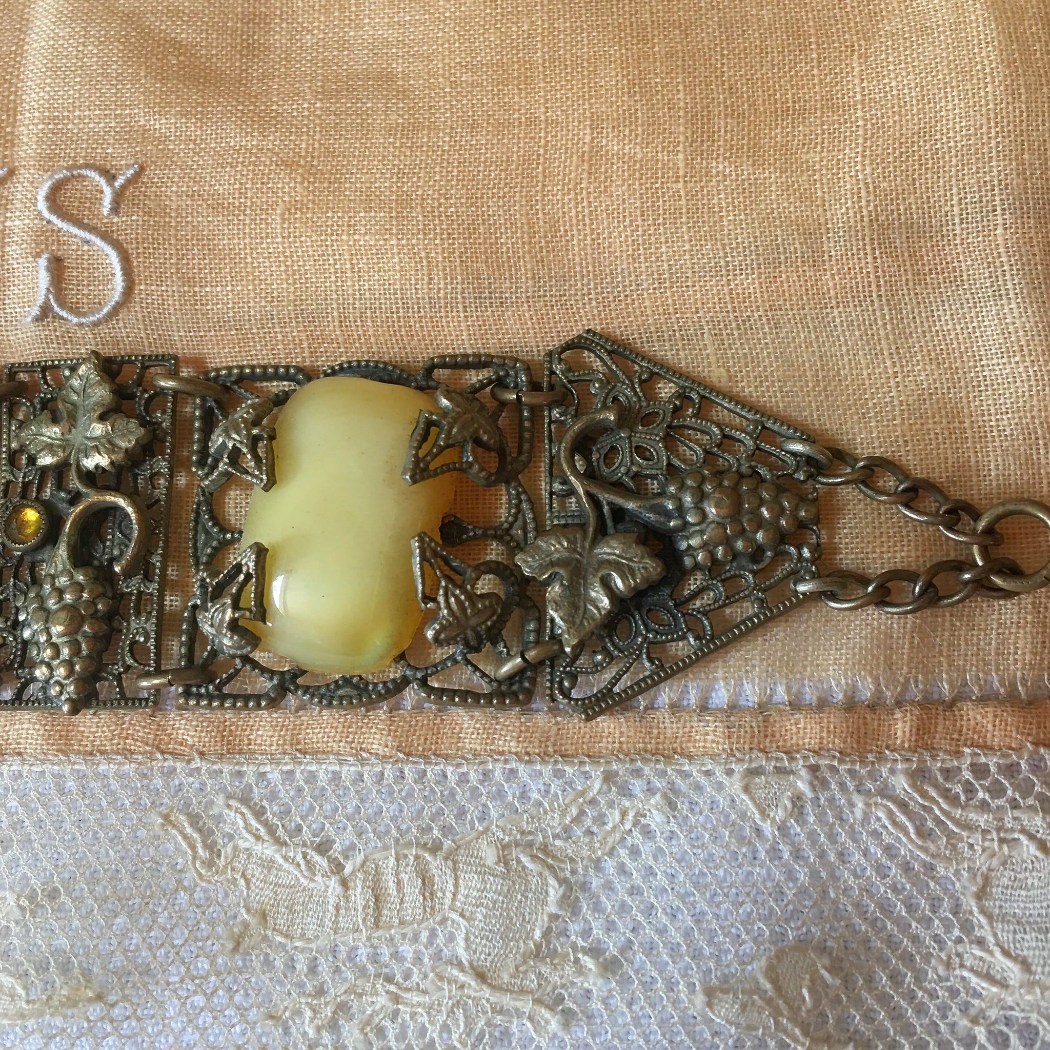 Art Deco bracelet with detailed metalwork and soft yellow cabochons, possibly Czech glass. Each of the five filigree panels features a grapevine motif with leaves and clusters. Measures approximately 7.5" long and 1" wide. The spring ring clasp works well and holds securely.