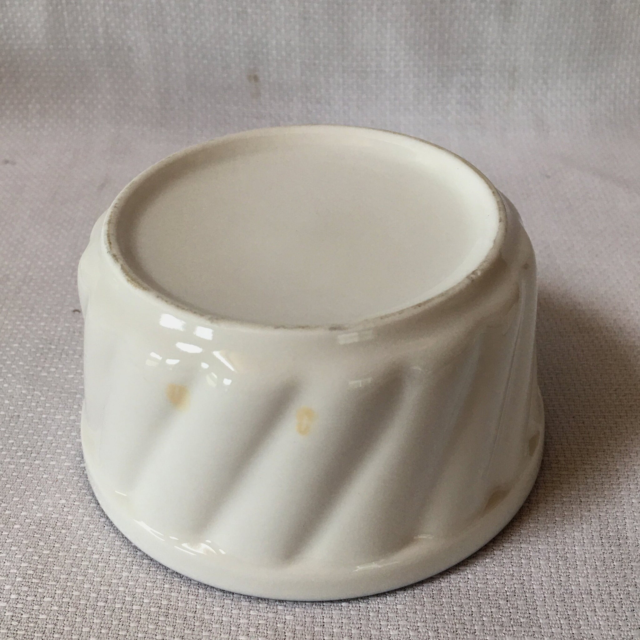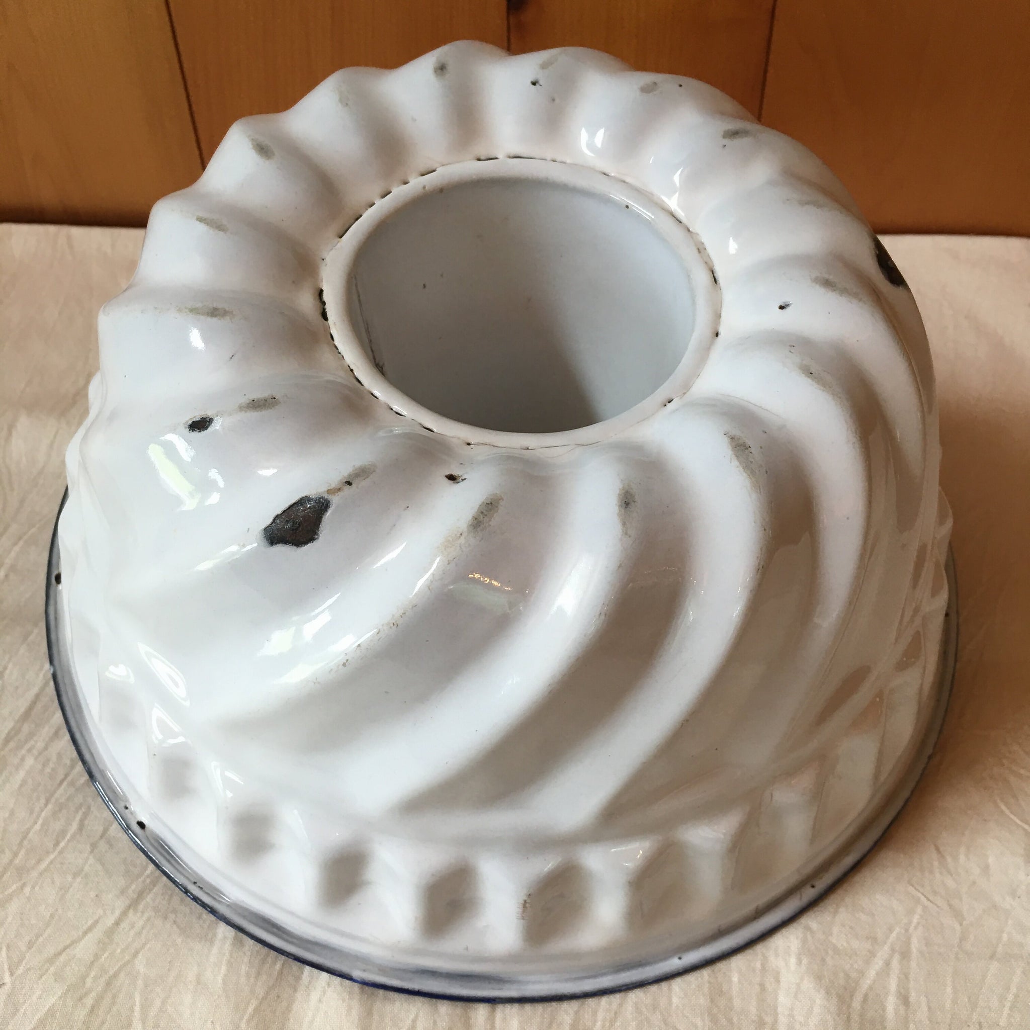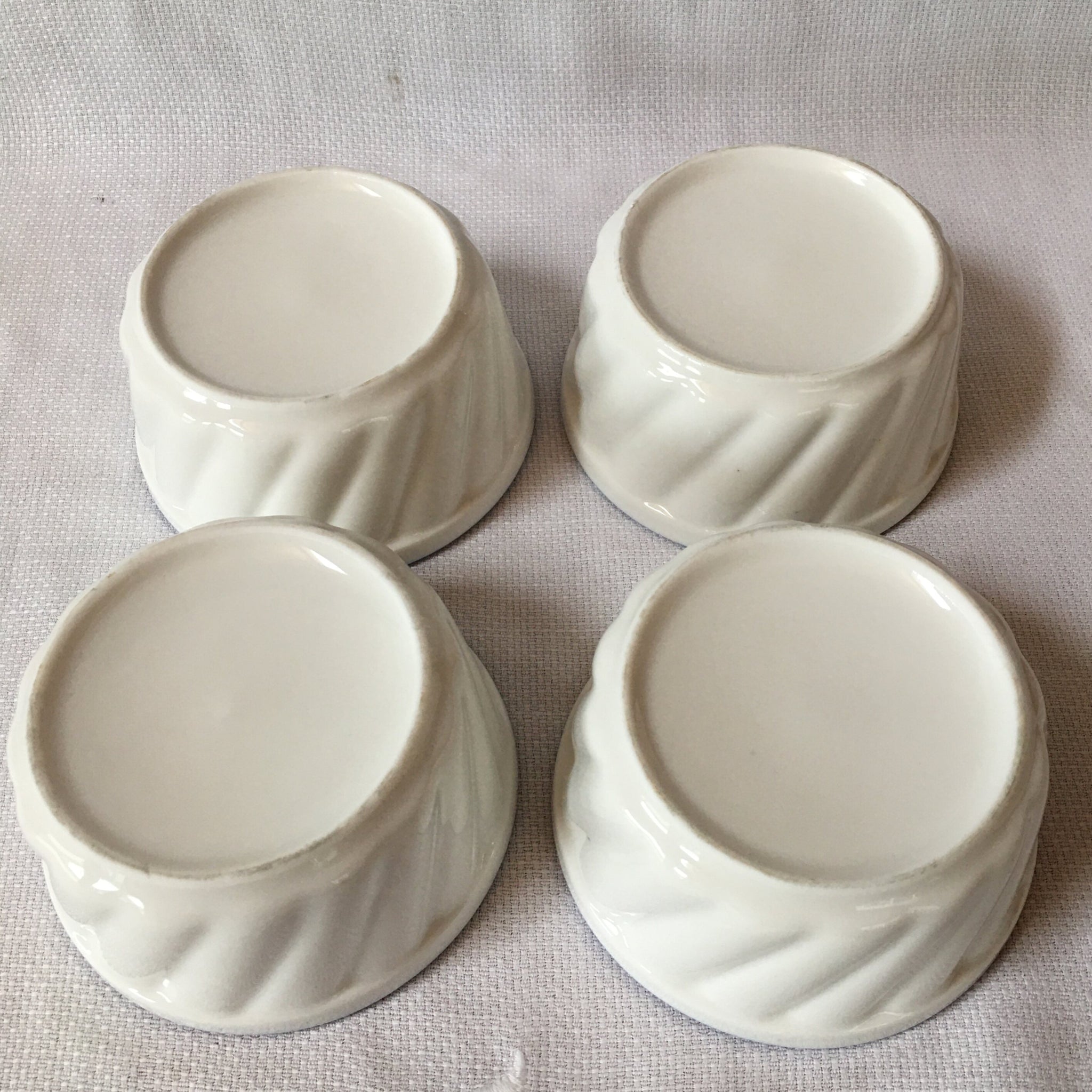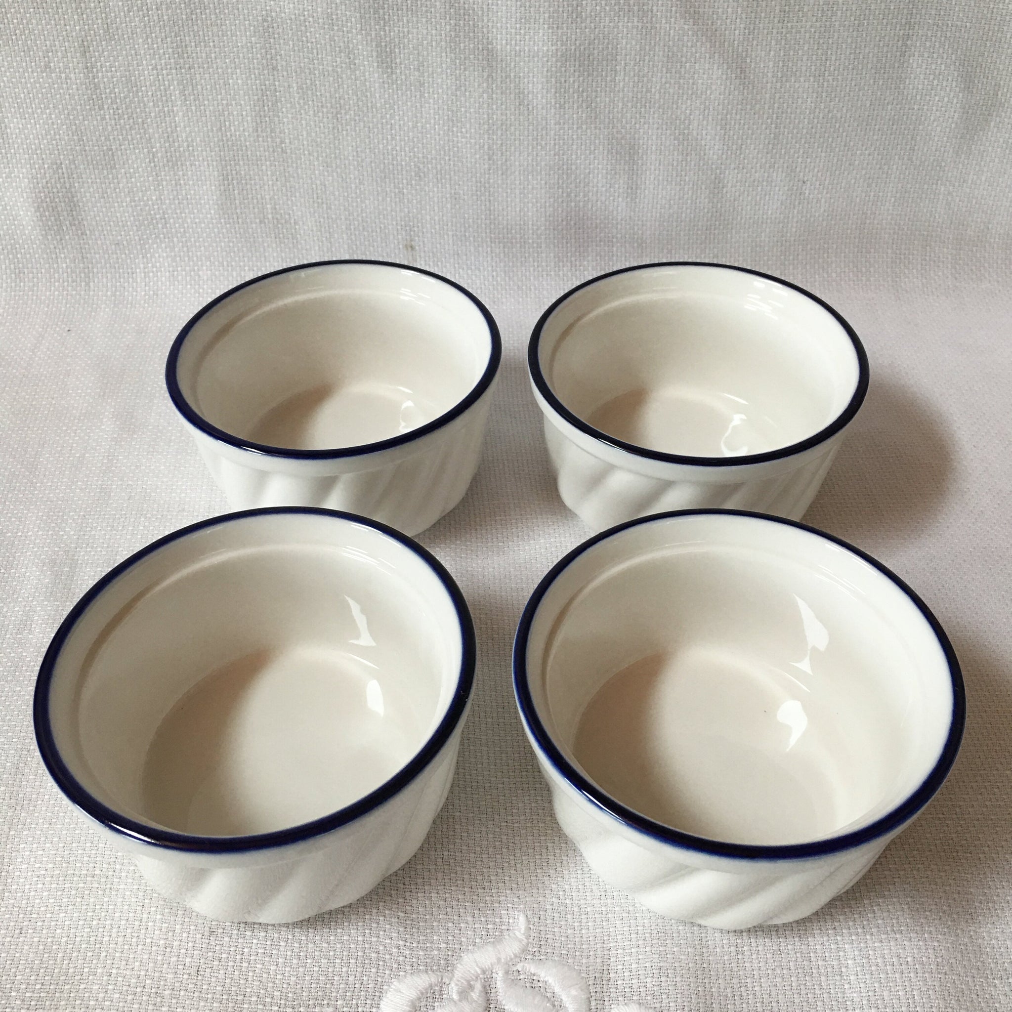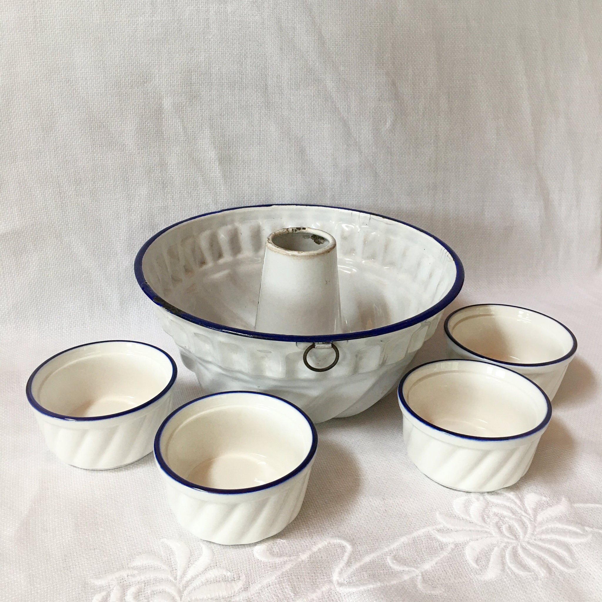 Vintage enamelware pan with four ceramic custard cups. White with blue rim and swirl design. Pan measures 10" diameter, 5" deep. Cups measure 2" tall, 4" diameter. Pan shows light wear from use. Cups have no chips or cracks; one has two small rust spots on the side.