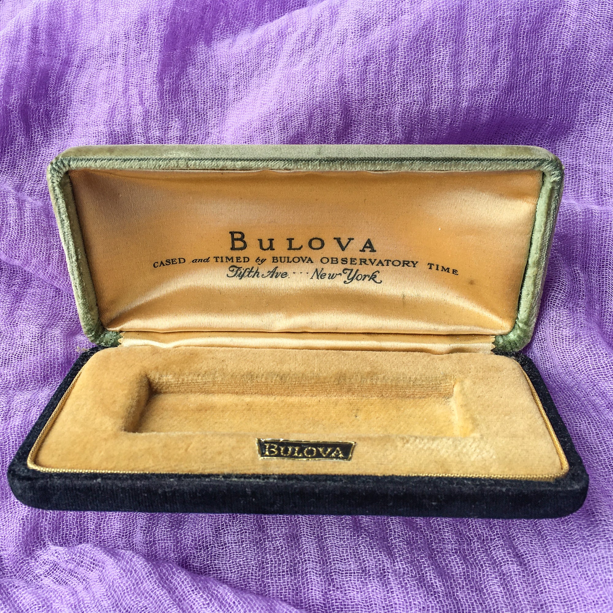 1930s Bulova Velvet Watch Box – Fifth Ave NYC, Gold Silk Interior, Observatory Time