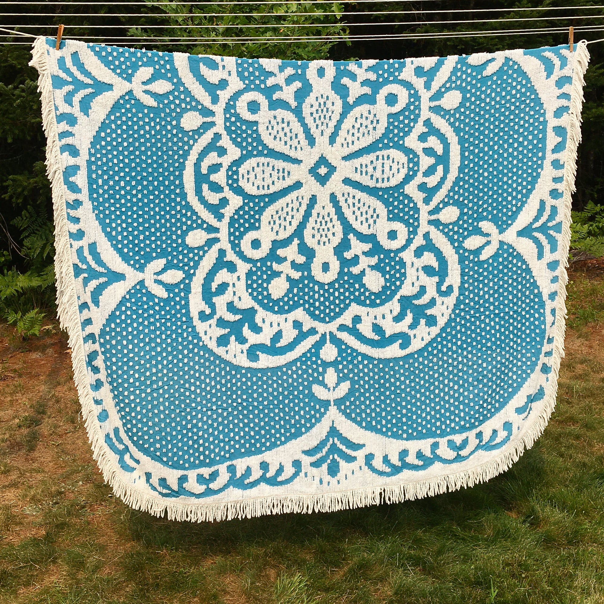 Vintage 1950s-60s Chenille Bedspread, Peacock Blue with White Detail