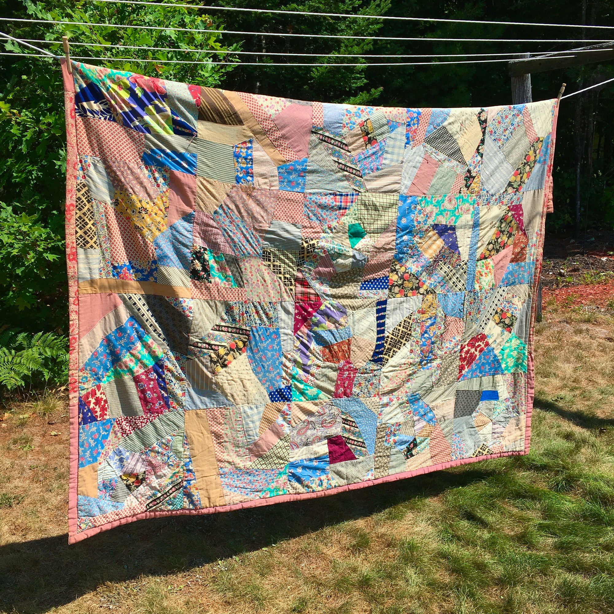 Vintage Log Cabin Quilt, Depression Era, Wool, Flannel, Cotton