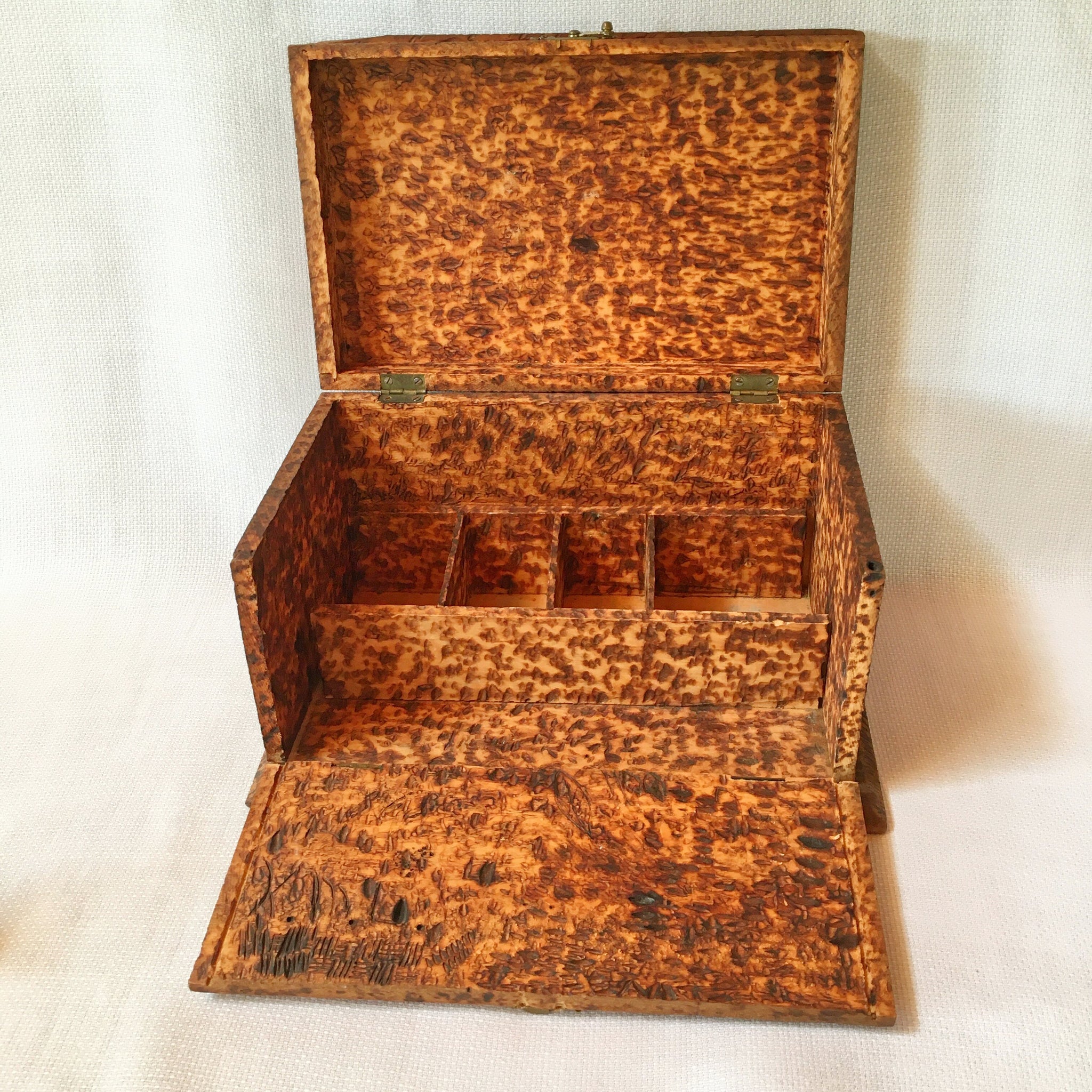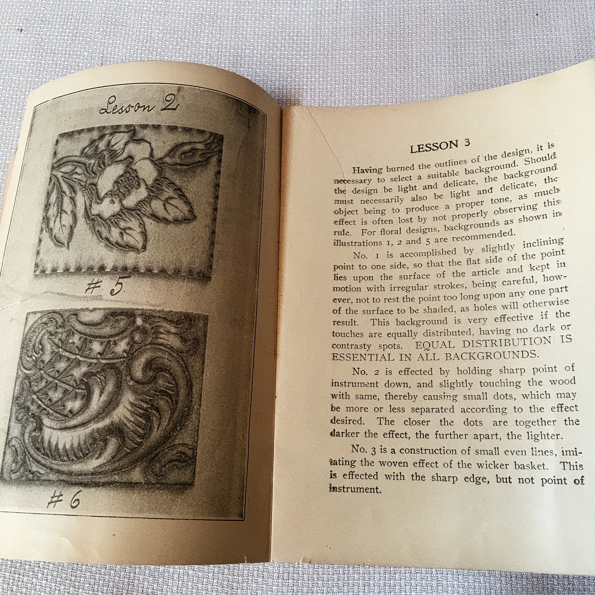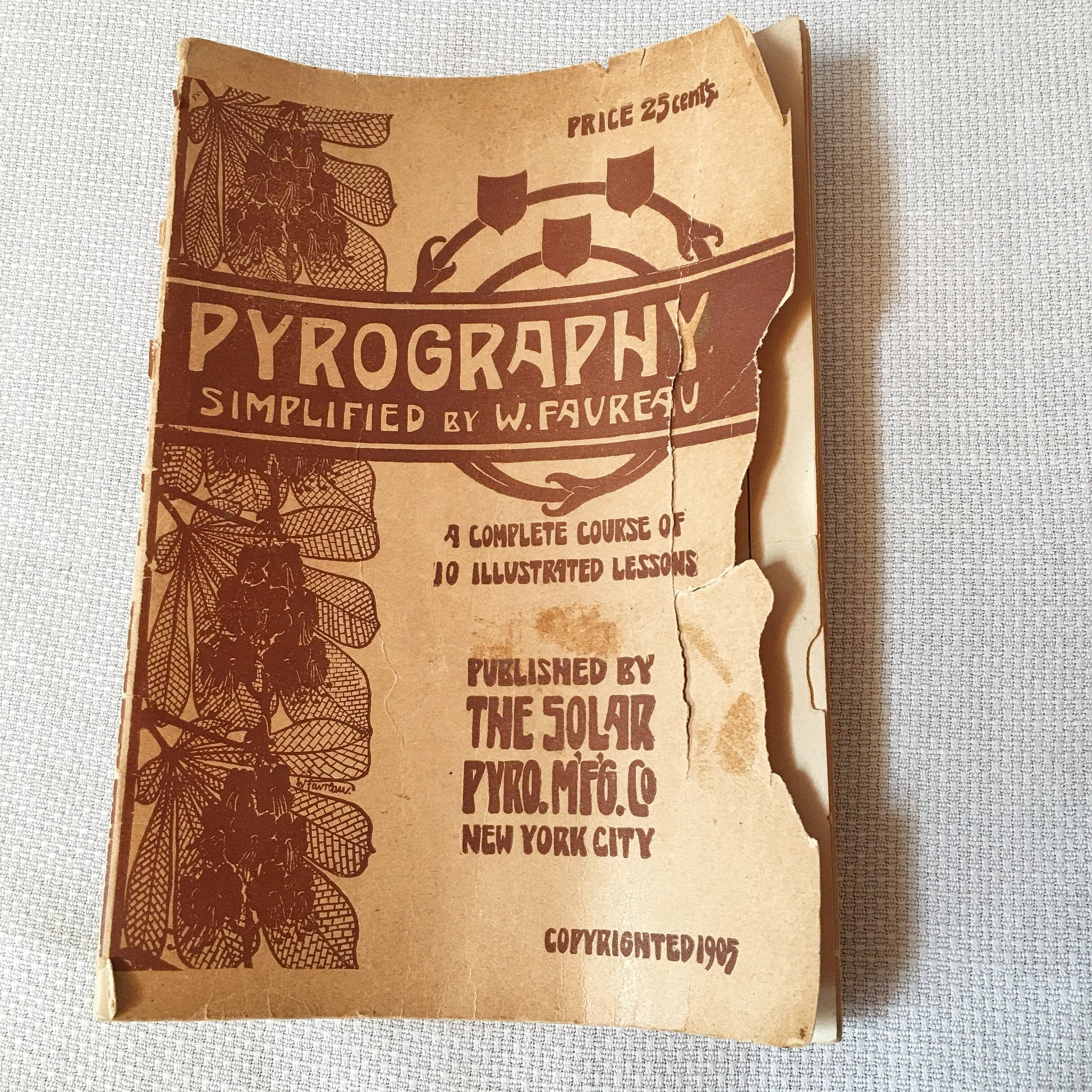 Partial wood burning kit in original box with cherry design. Front folds down and latch and hinges work well. Includes original bottles, lamps for heating and tools plus a 1905 “Pyrography Simplified” booklet. Bottles and lamps are in very good condition with readable labels; box shows light age wear only. Figures on the bottom may indicate the original price of $3.95. Great oddity display piece!