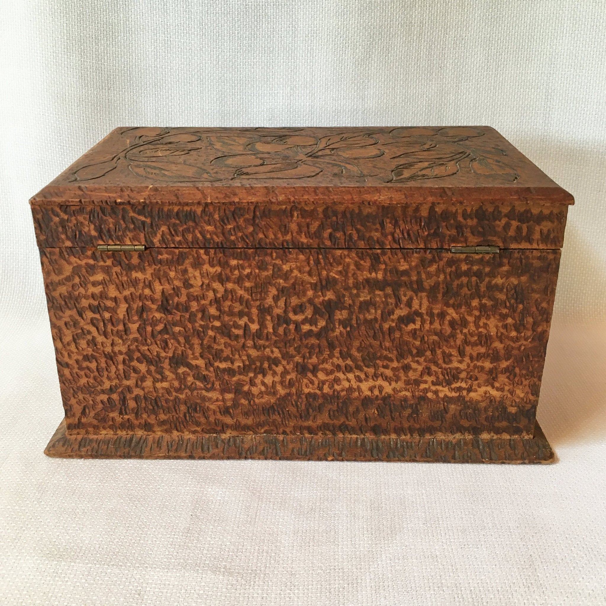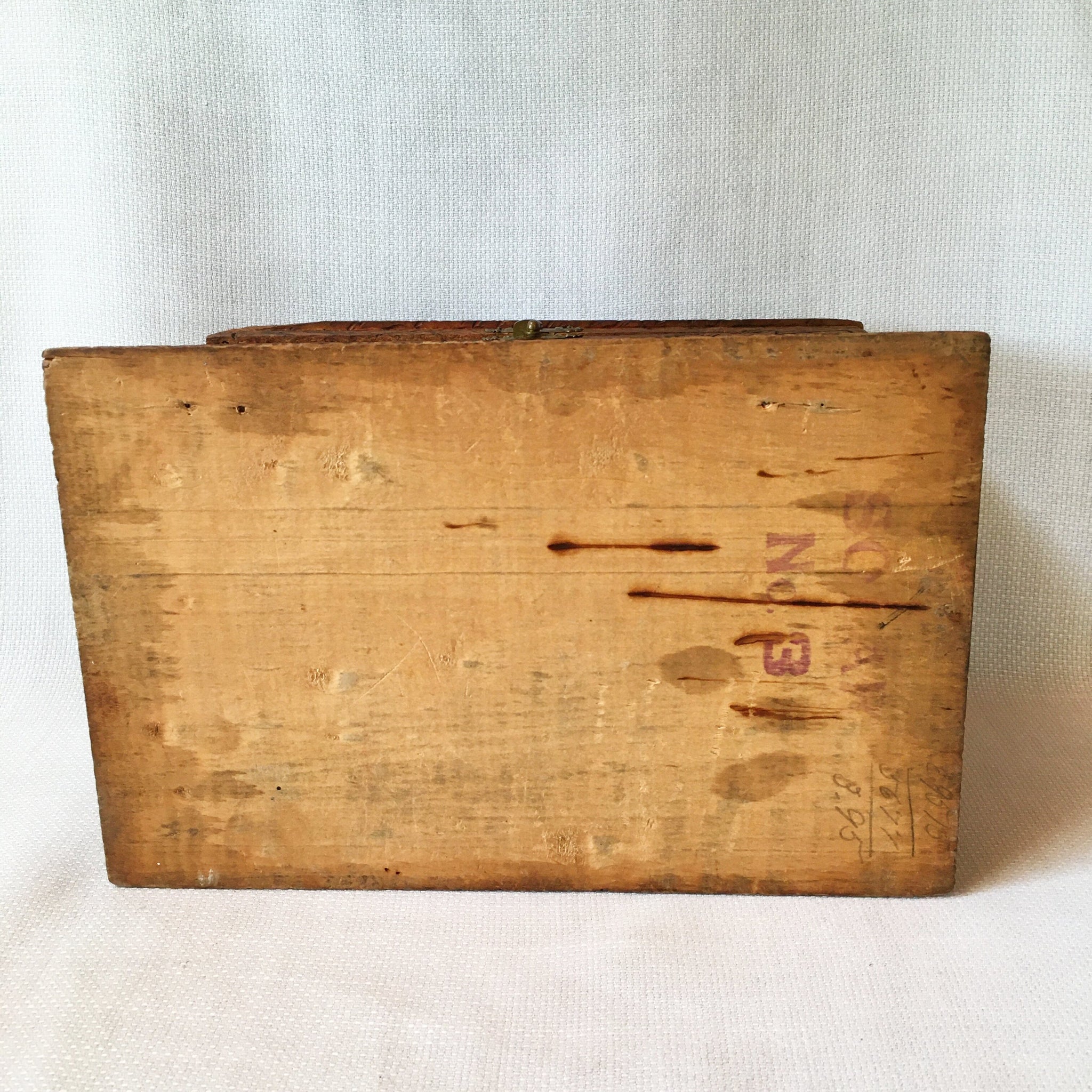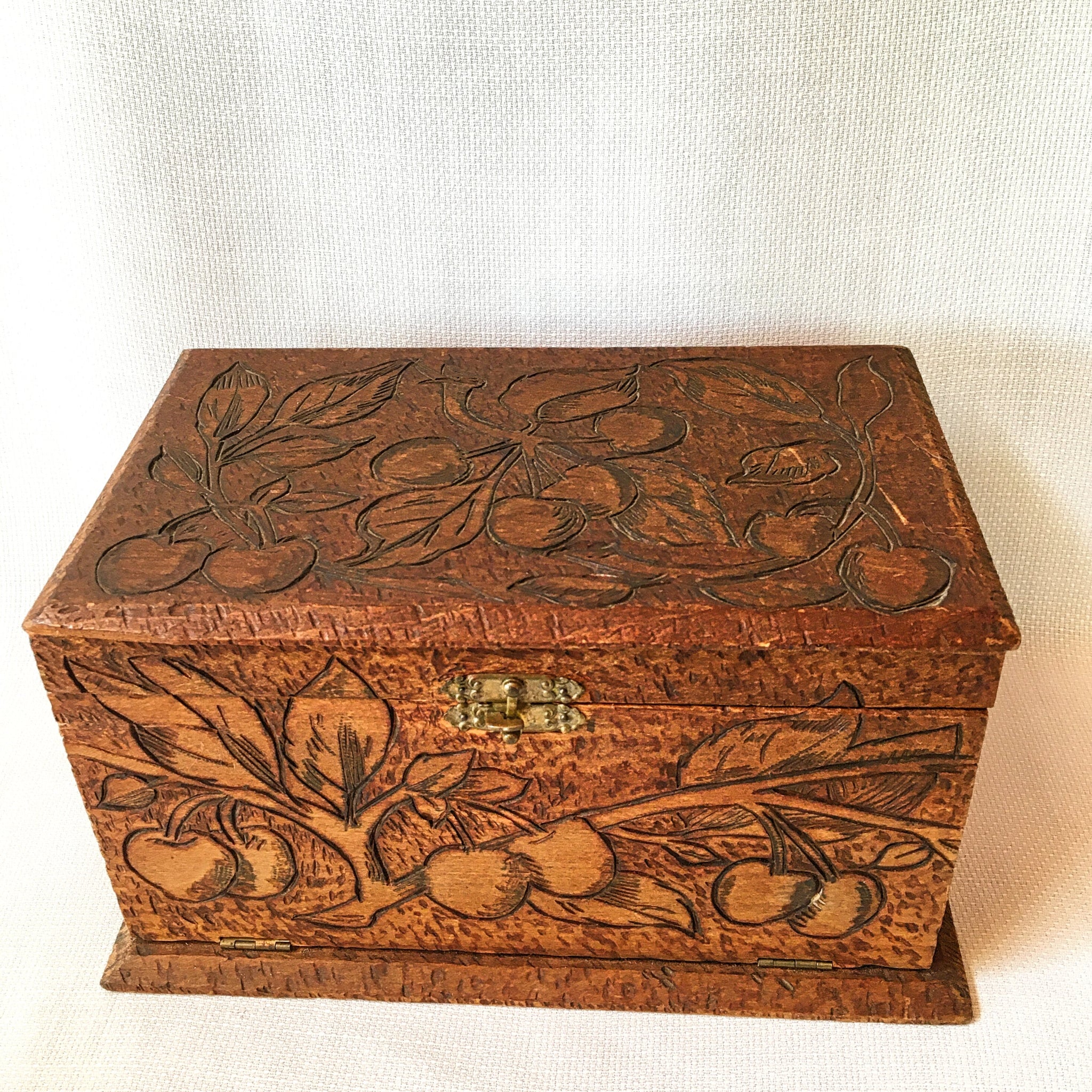 Partial wood burning kit in original box with cherry design. Front folds down and latch and hinges work well. Includes original bottles, lamps for heating and tools plus a 1905 “Pyrography Simplified” booklet. Bottles and lamps are in very good condition with readable labels; box shows light age wear only. Figures on the bottom may indicate the original price of $3.95. Great oddity display piece!