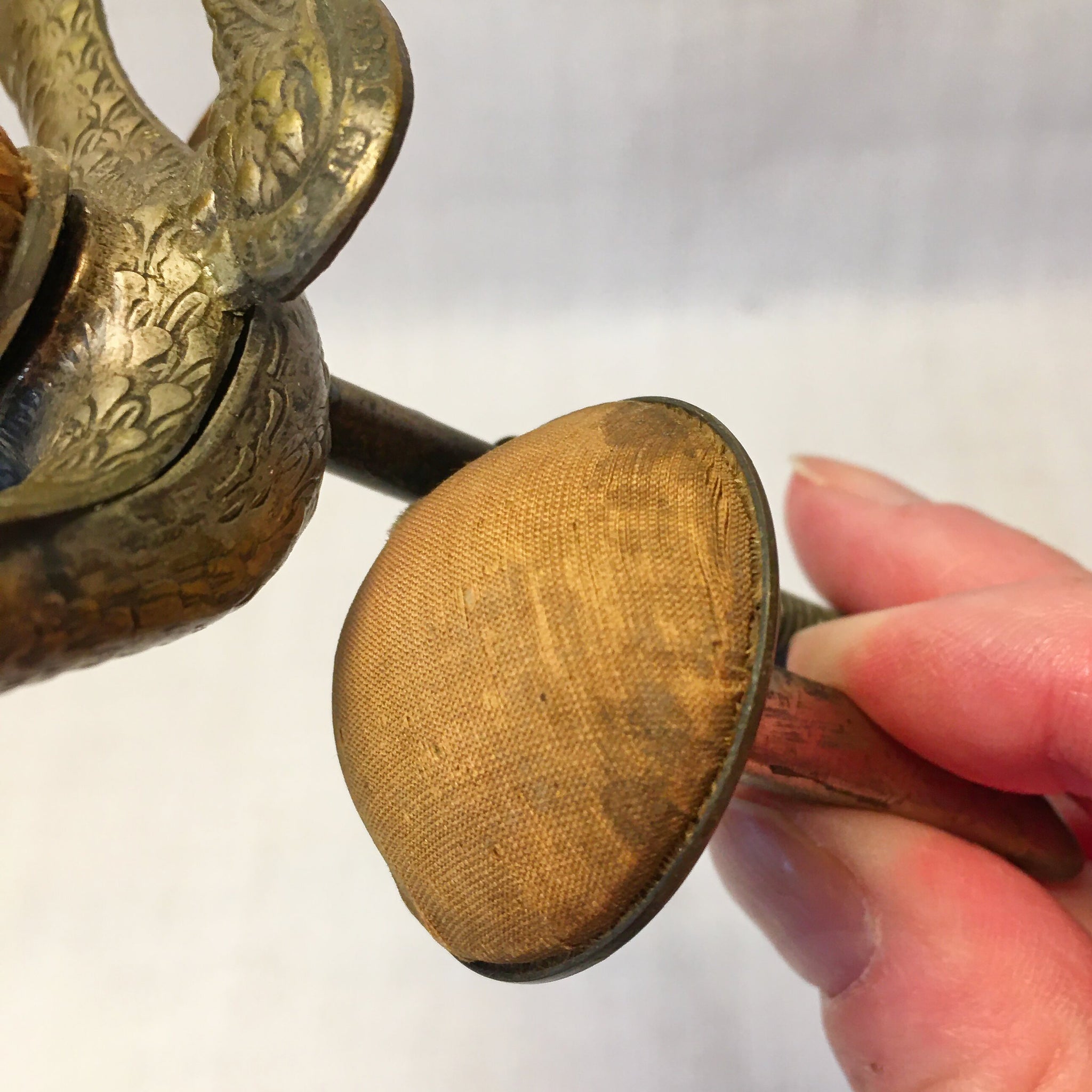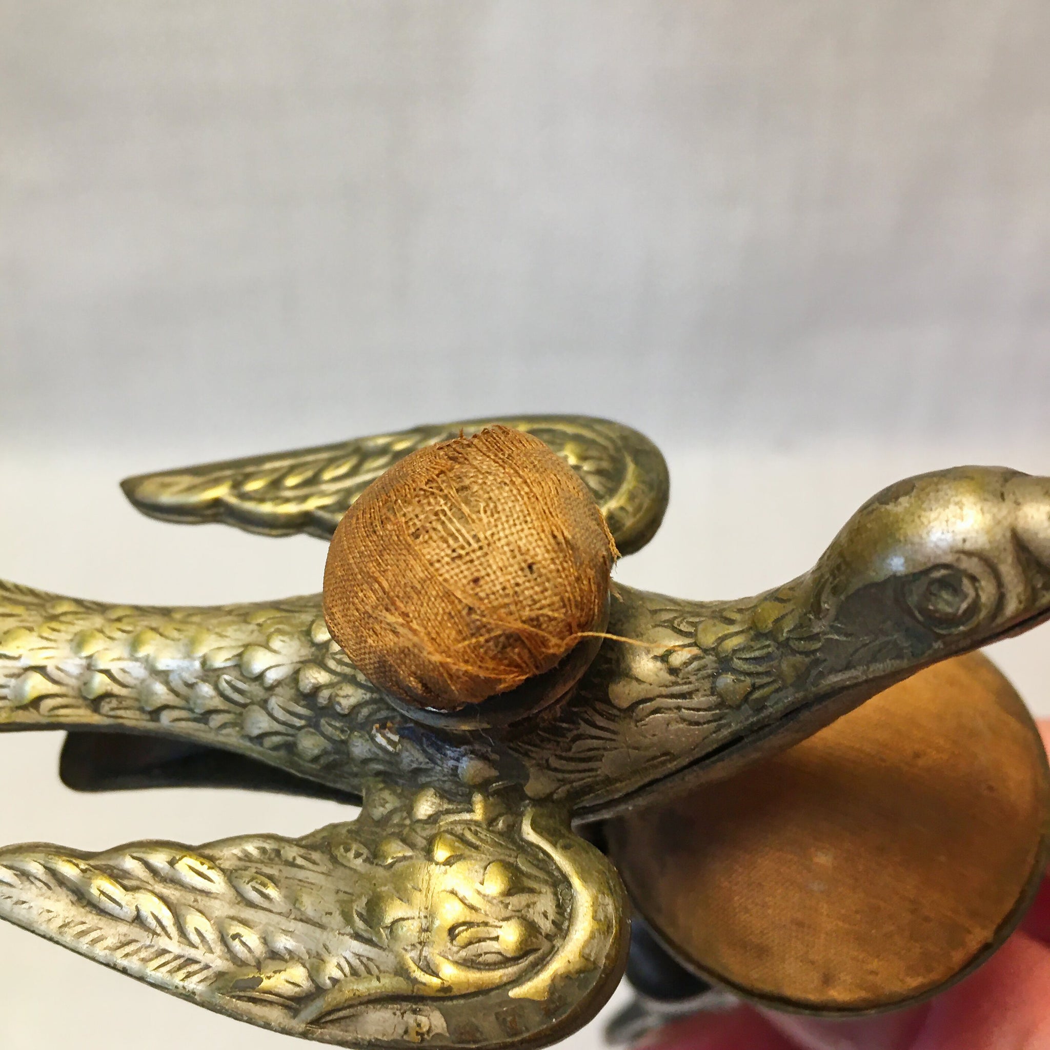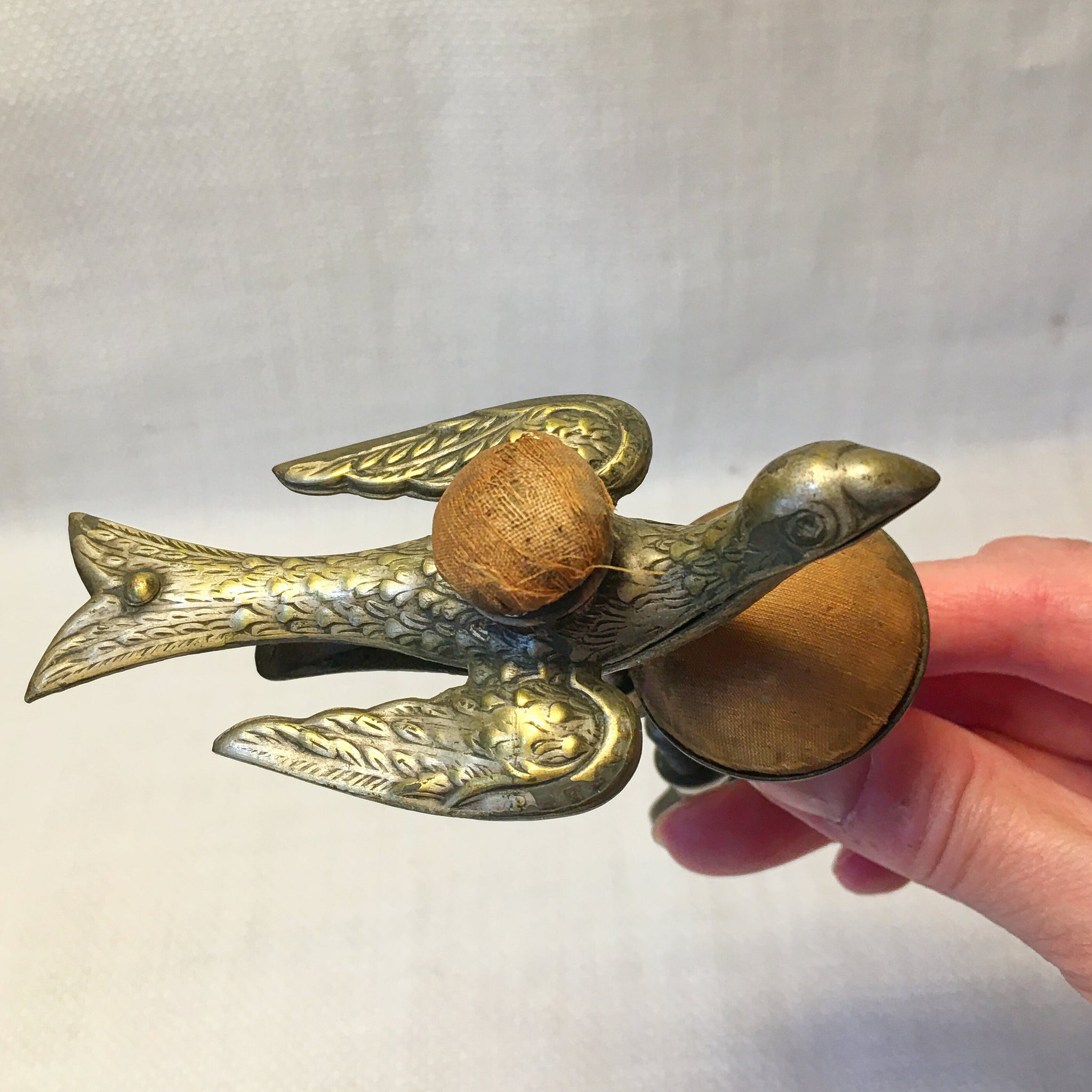 Victorian brass sewing bird dating to approximately the 1850s–1870s. The screw clamp tightens well, and the beak spring opens and closes smoothly. Both original pin cushions are present — the top cushion shows wear, and the side cushion has age-related discoloration, as shown. There is a slight bend in the clamp frame, but it remains stable and functional. The red catalog number on the underside identifies it as an item from Anne Eisenhower’s collection.