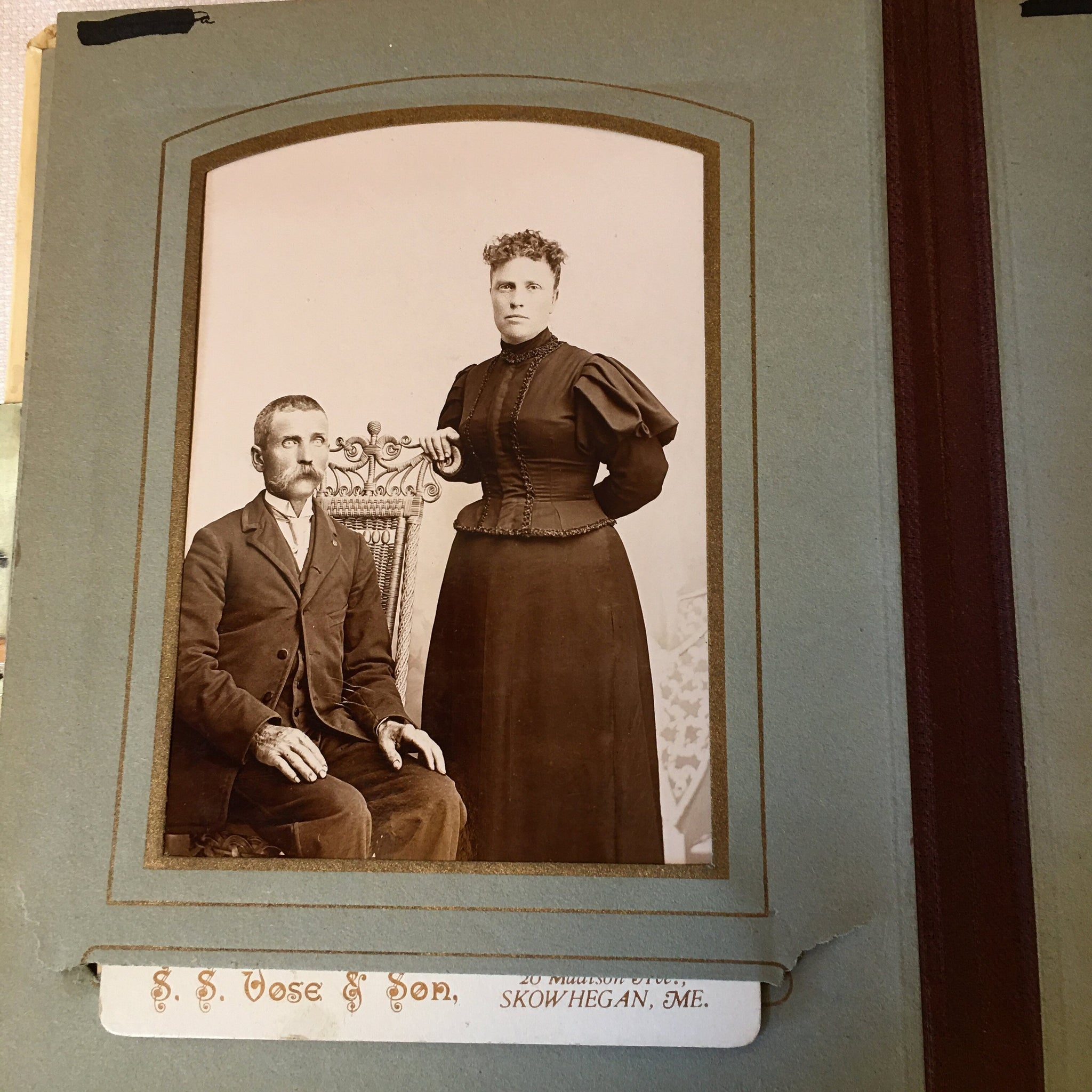 Antique Victorian celluloid photo album with rose design and working clasp, filled with 21 original family photographs.