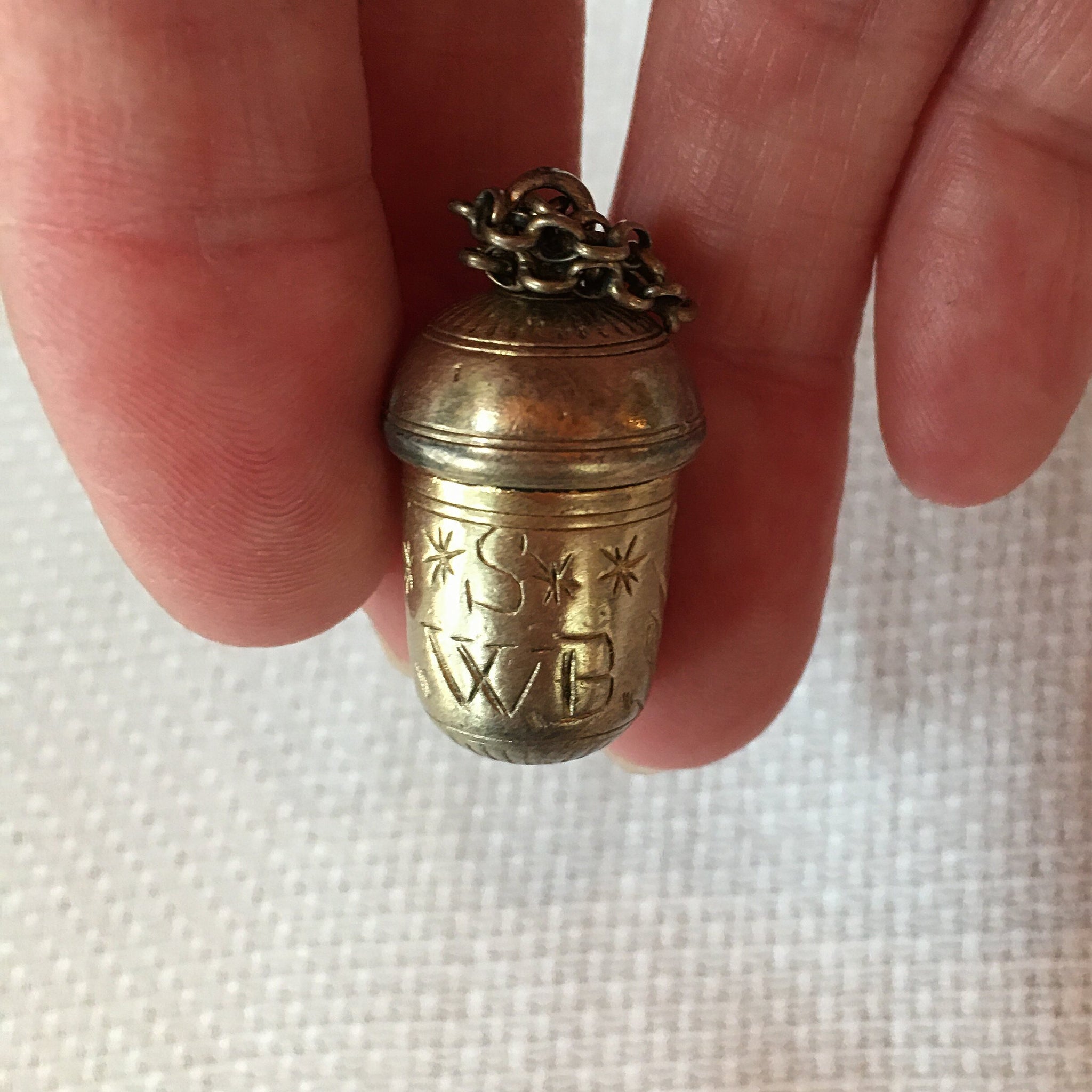 The base holds a removable red velvet pin cushion that fits neatly inside. When removed, the base can be used as a thimble, though it fits a very petite finger. The outside is engraved with the initials S.W.B., along with decorative stars, a crowned figure, and floral or leaf motifs. The cover screws on securely. Has a light patina consistent with age.