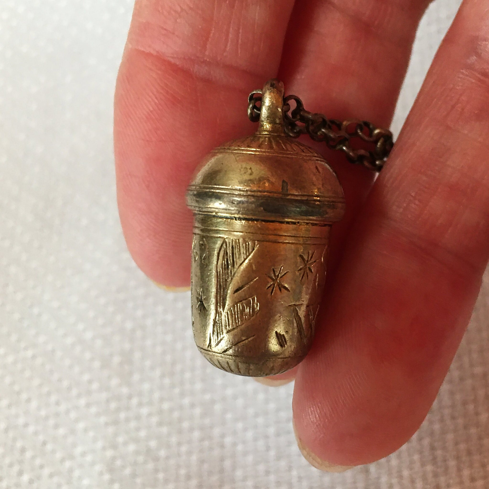 Small antique sewing thimble and pin cushion combination, likely made of unmarked sterling silver. The piece measures about 1" tall and has a screw-on lid with a short chain attachment, likely meant for a sewing chatelaine set.