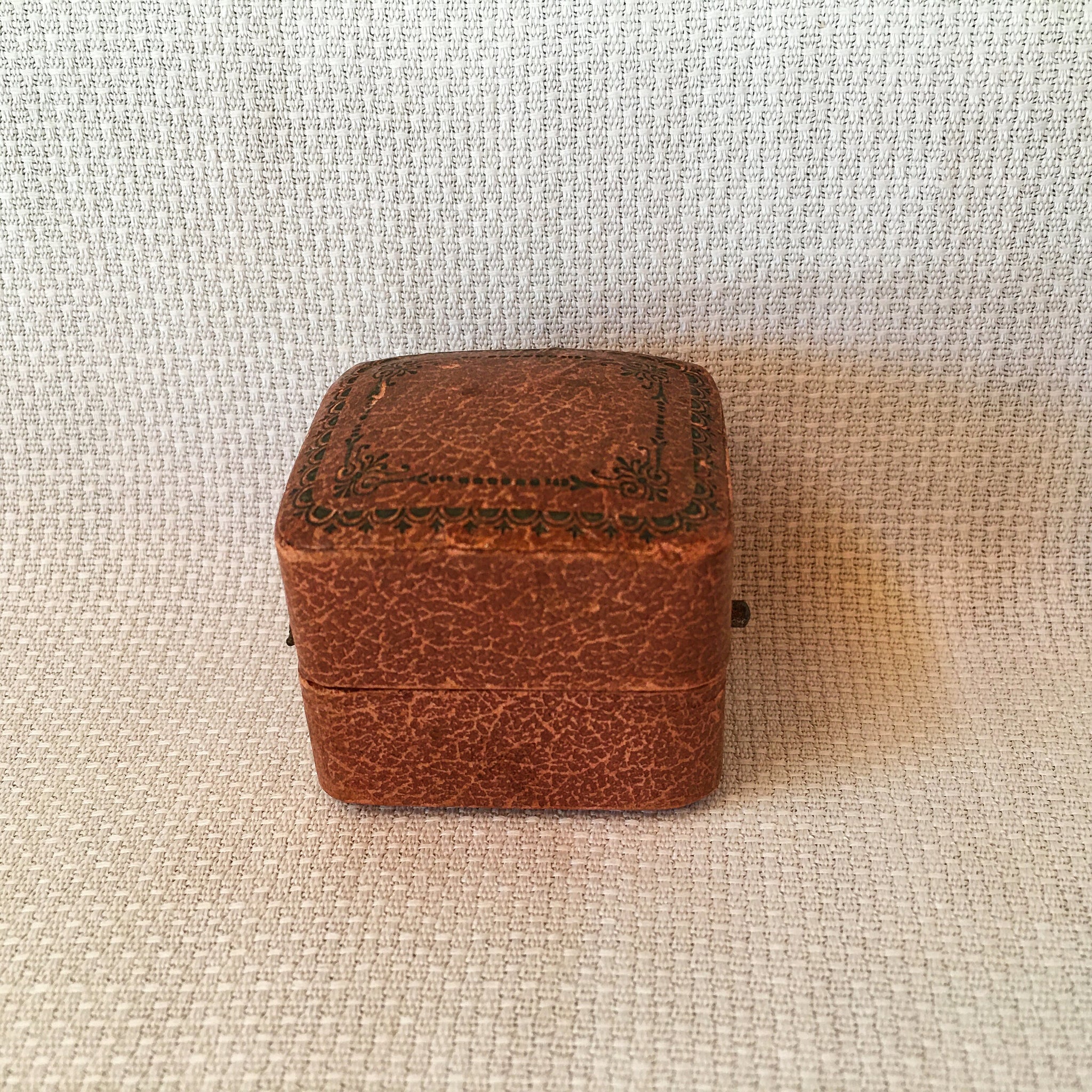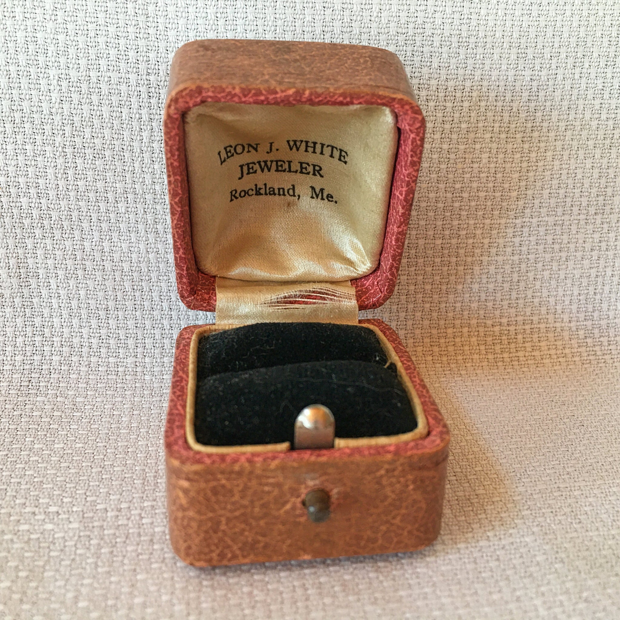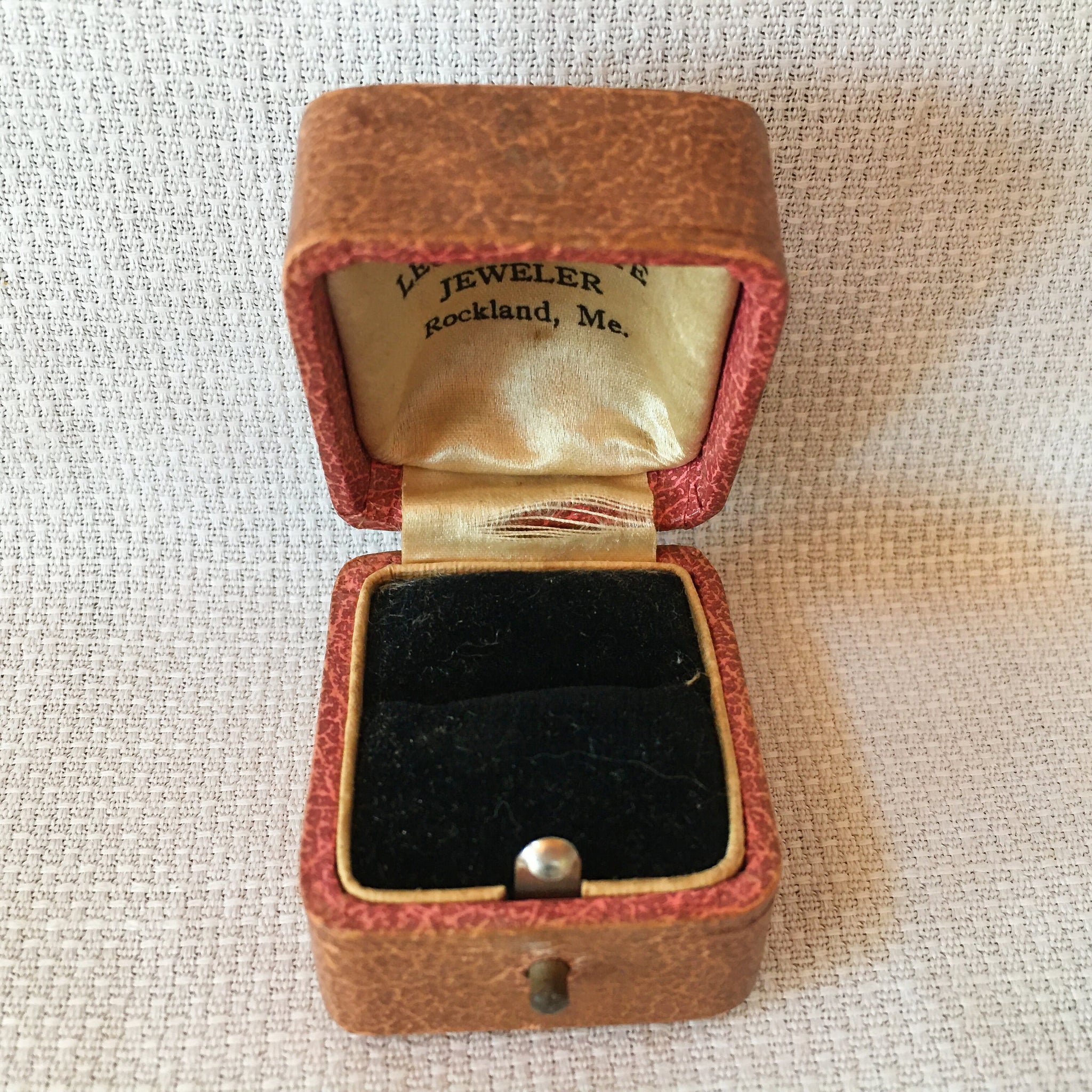 Antique ring presentation box dating to the early 1900s. Square form with brown leather exterior featuring decorative border detail on the lid. Interior is velvet-lined with a silk-lined lid printed “Leon J. White, Jeweler, Rockland, Me.” The clasp is intact and works properly. Condition is very good overall, with expected surface wear to the leather consistent with age. There is some deterioration to the silk at the hinge area inside, as shown in photos.