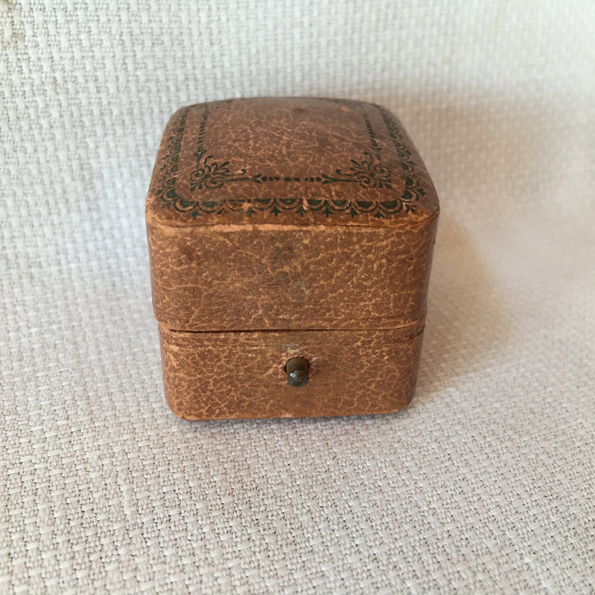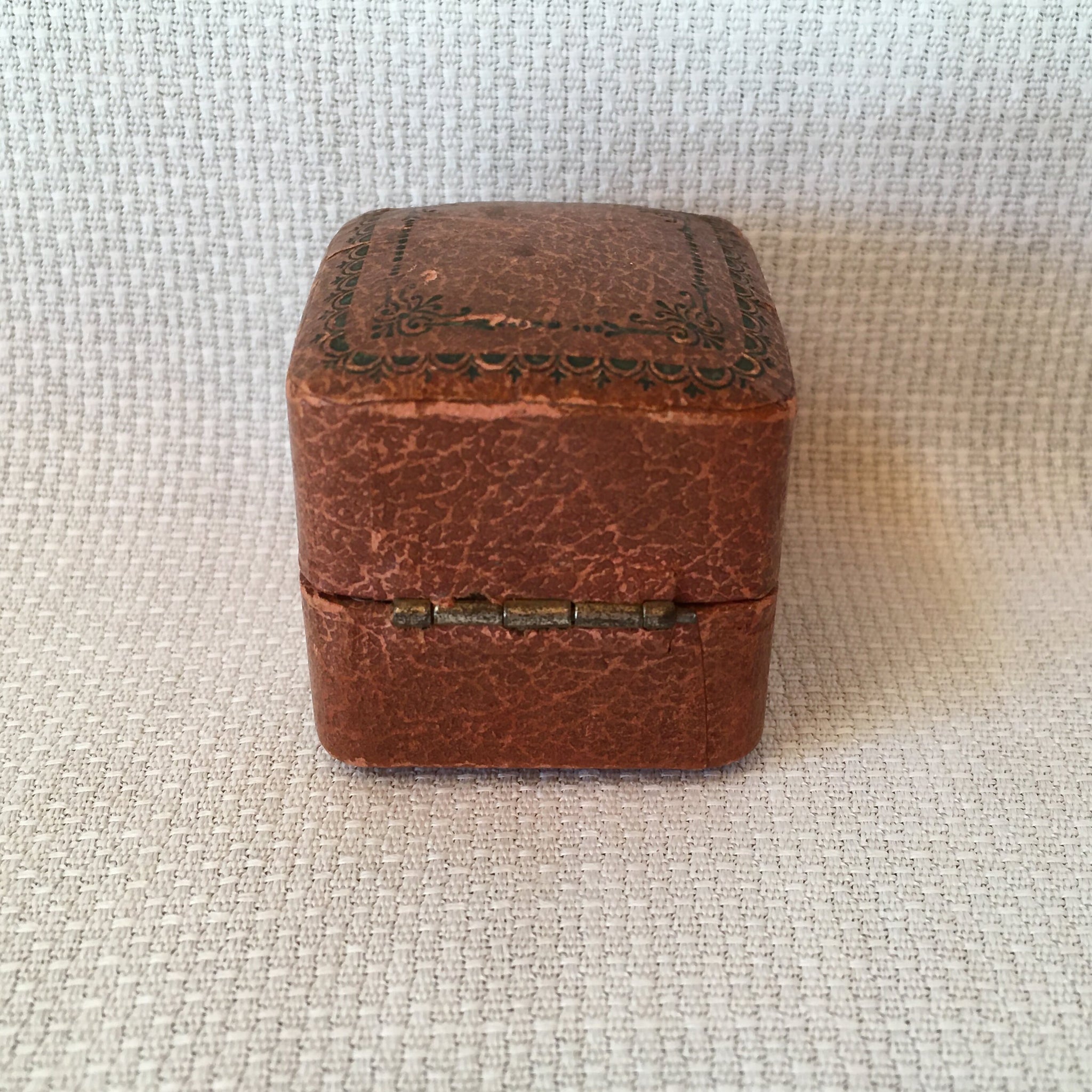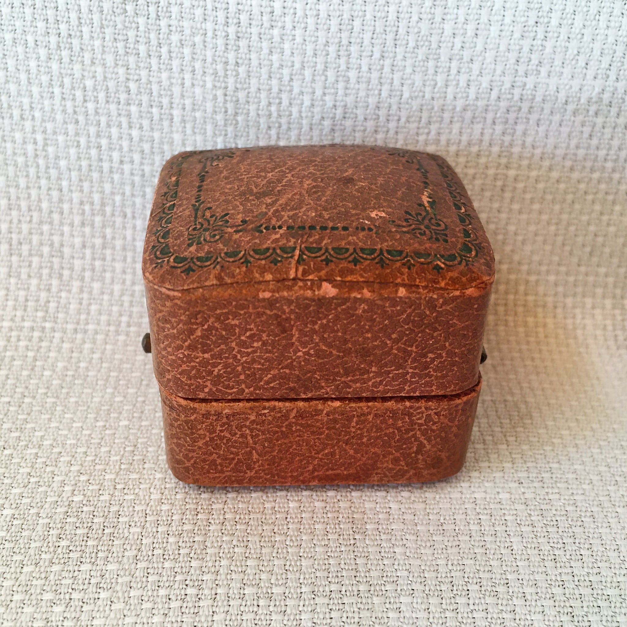 Antique ring presentation box dating to the early 1900s. Square form with brown leather exterior featuring decorative border detail on the lid. Interior is velvet-lined with a silk-lined lid printed “Leon J. White, Jeweler, Rockland, Me.” The clasp is intact and works properly. Condition is very good overall, with expected surface wear to the leather consistent with age. There is some deterioration to the silk at the hinge area inside, as shown in photos.