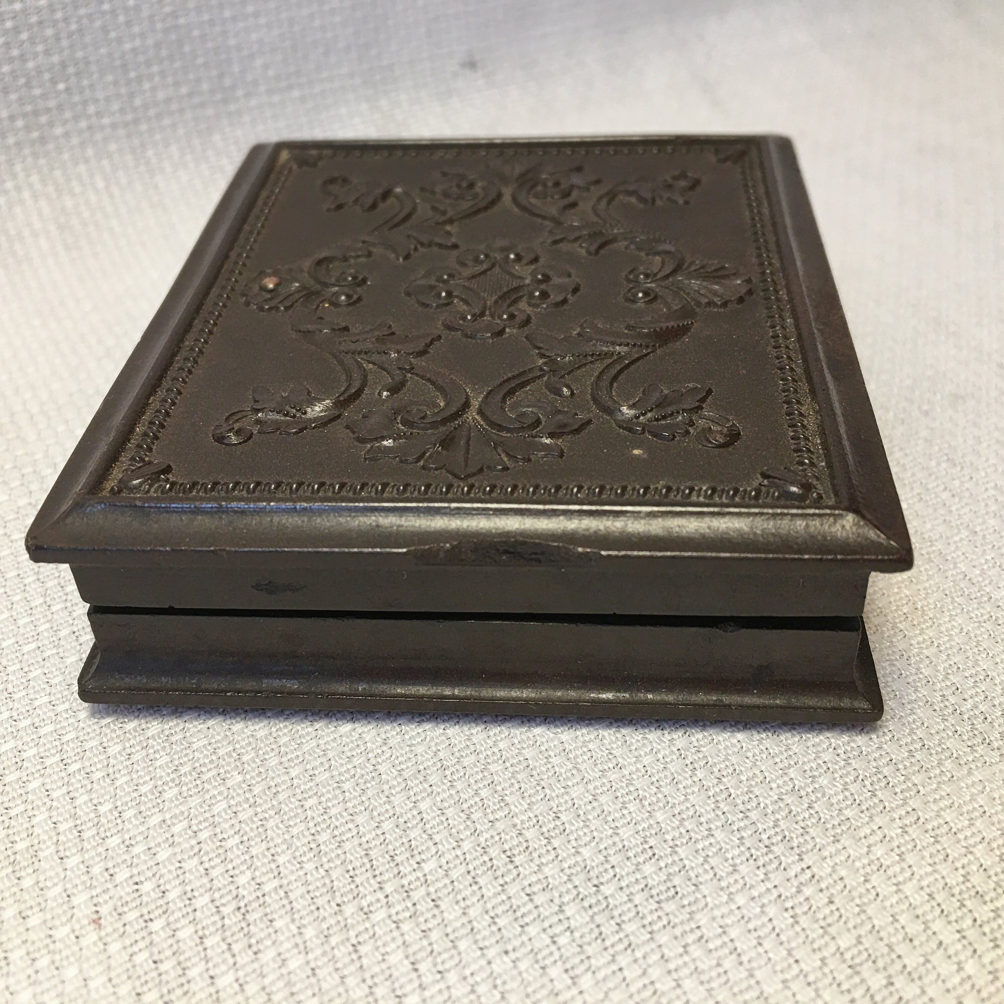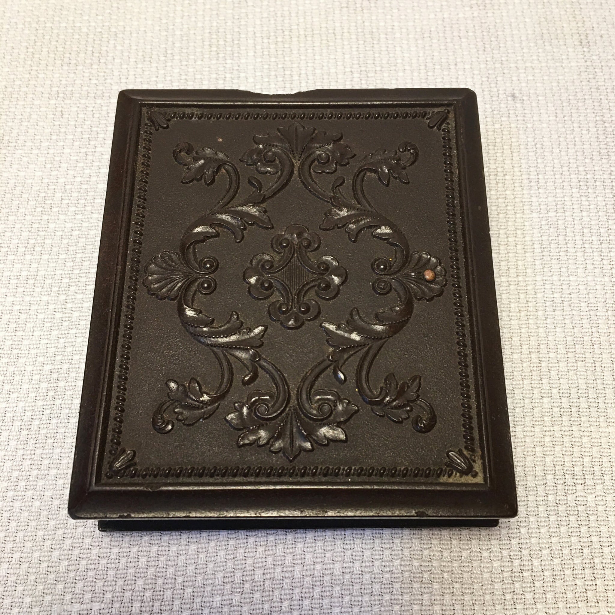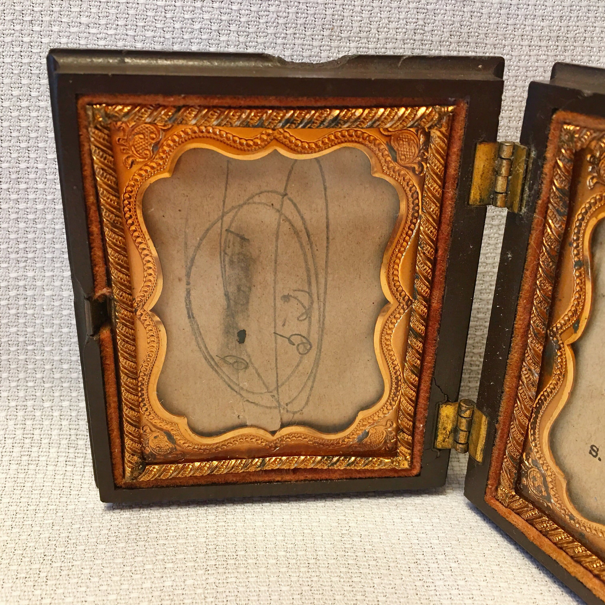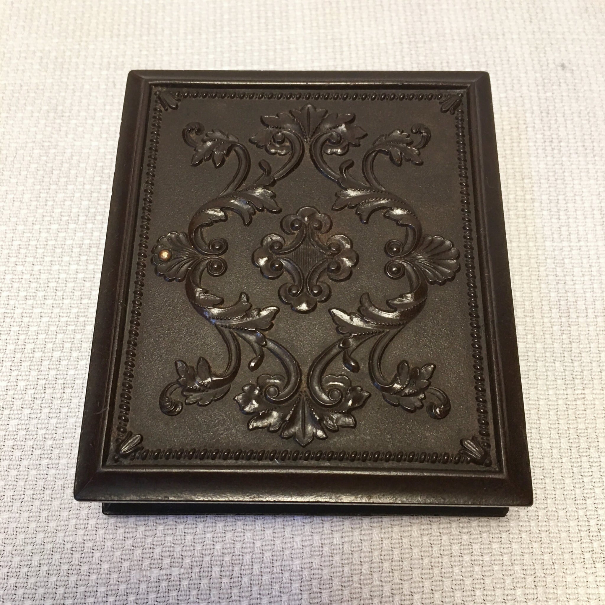 Antique “Genuine Union Case” dating to about 1855–1860, made under S. Peck’s early photography case patents. This small 3" x 2.5" case once held an ambrotype or tintype photograph and still retains its original decorative brass mats and patent paper. The glass is intact and has no cracks or chips. One hinge has come away from the case, the top edge has a chip, and the latch is missing its handle, making it a bit tricky to open but still functional.