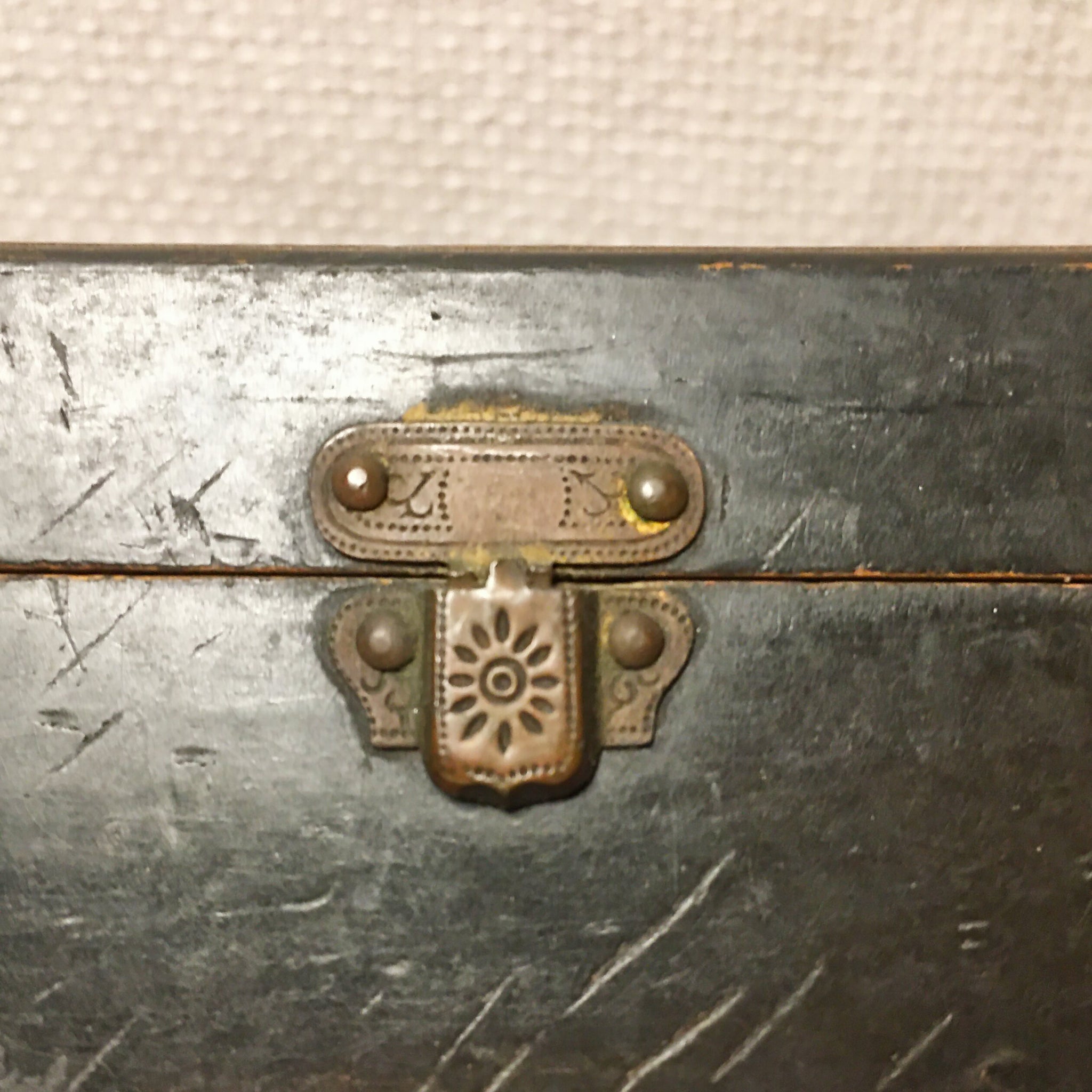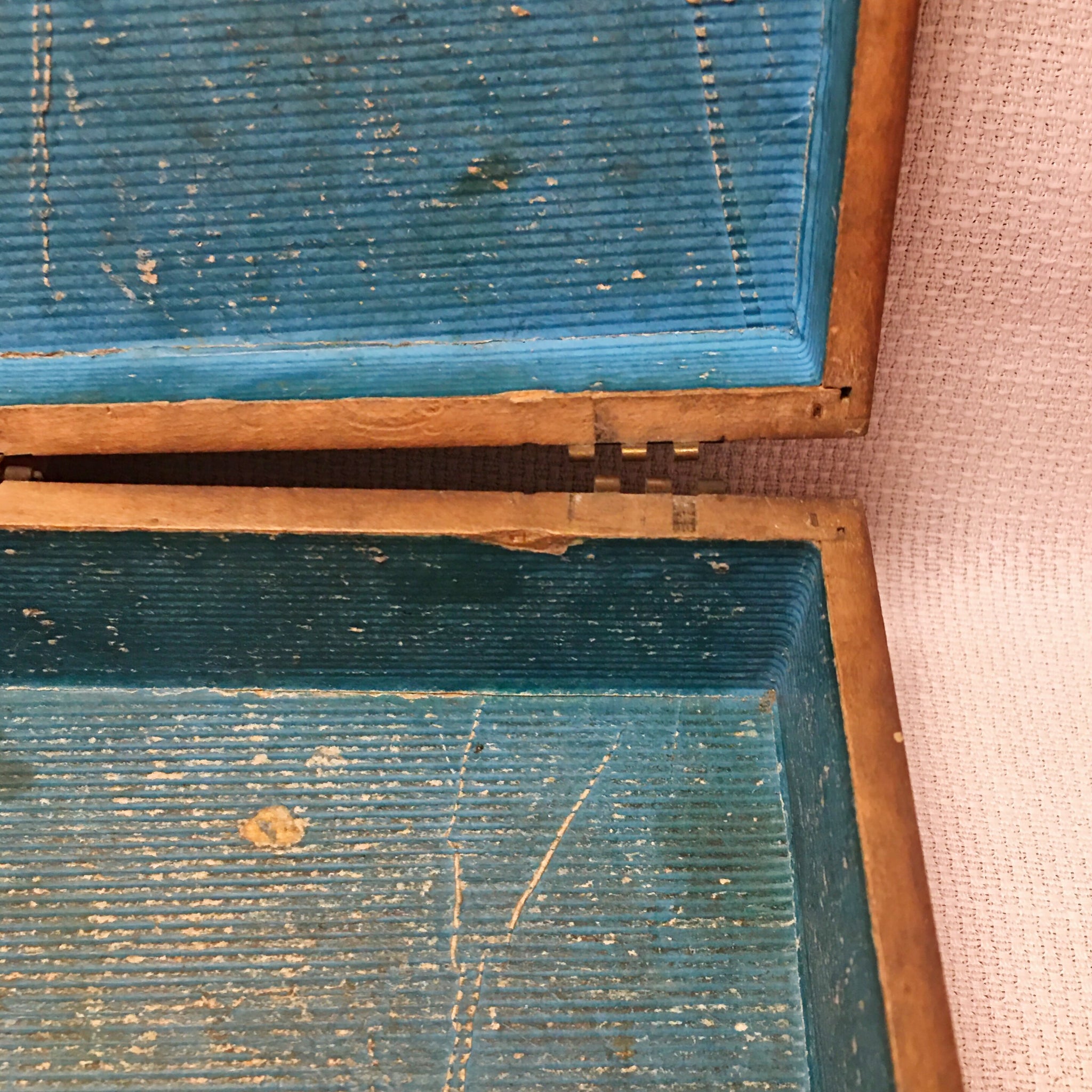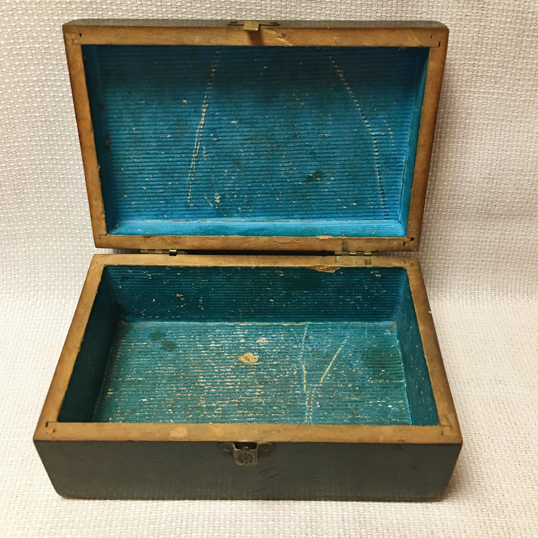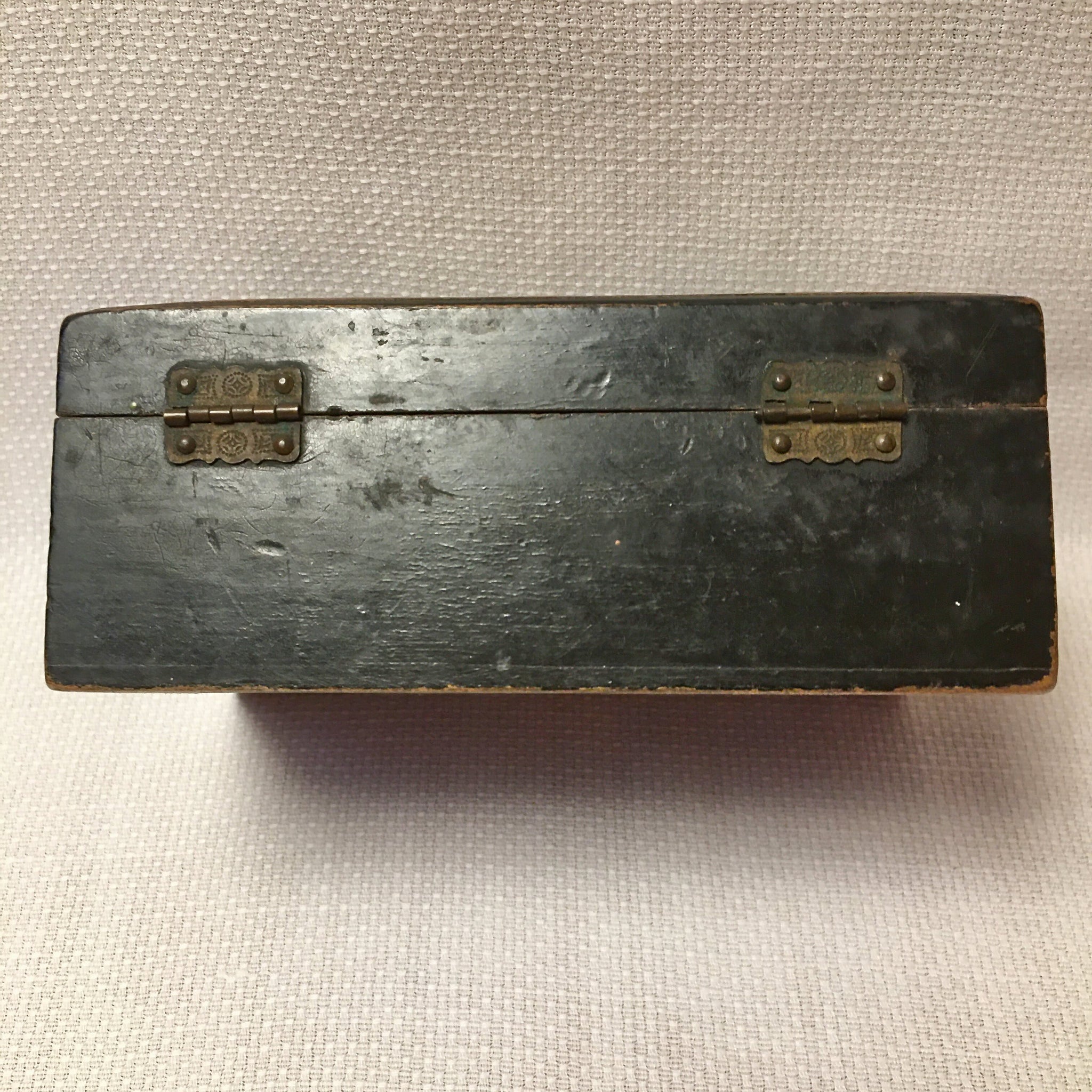 Antique Mauchline ware box featuring a floral transfer on the lid along with a “Friendship” verse. The exterior shows scattered scratches and age wear, the latch is broken and tricky to open. One hinge is partially broken and will need a tiny hinge pin to repair. The interior is lined with blue ribbed paper that shows noticeable wear but remains intact. Measures approximately 2" tall, 5" wide, and 3" deep.