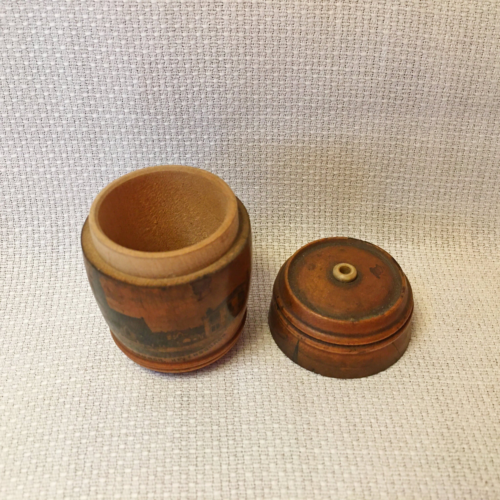 Mauchline Ware is so named because it was produced in or near a small town called Mauchline in Scotland. It is made of sycamore and often had transfer photos of popular tourist destinations. It was produced from the mid 1800’s until 1933 when the last Mauchline Ware factory was destroyed by fire.