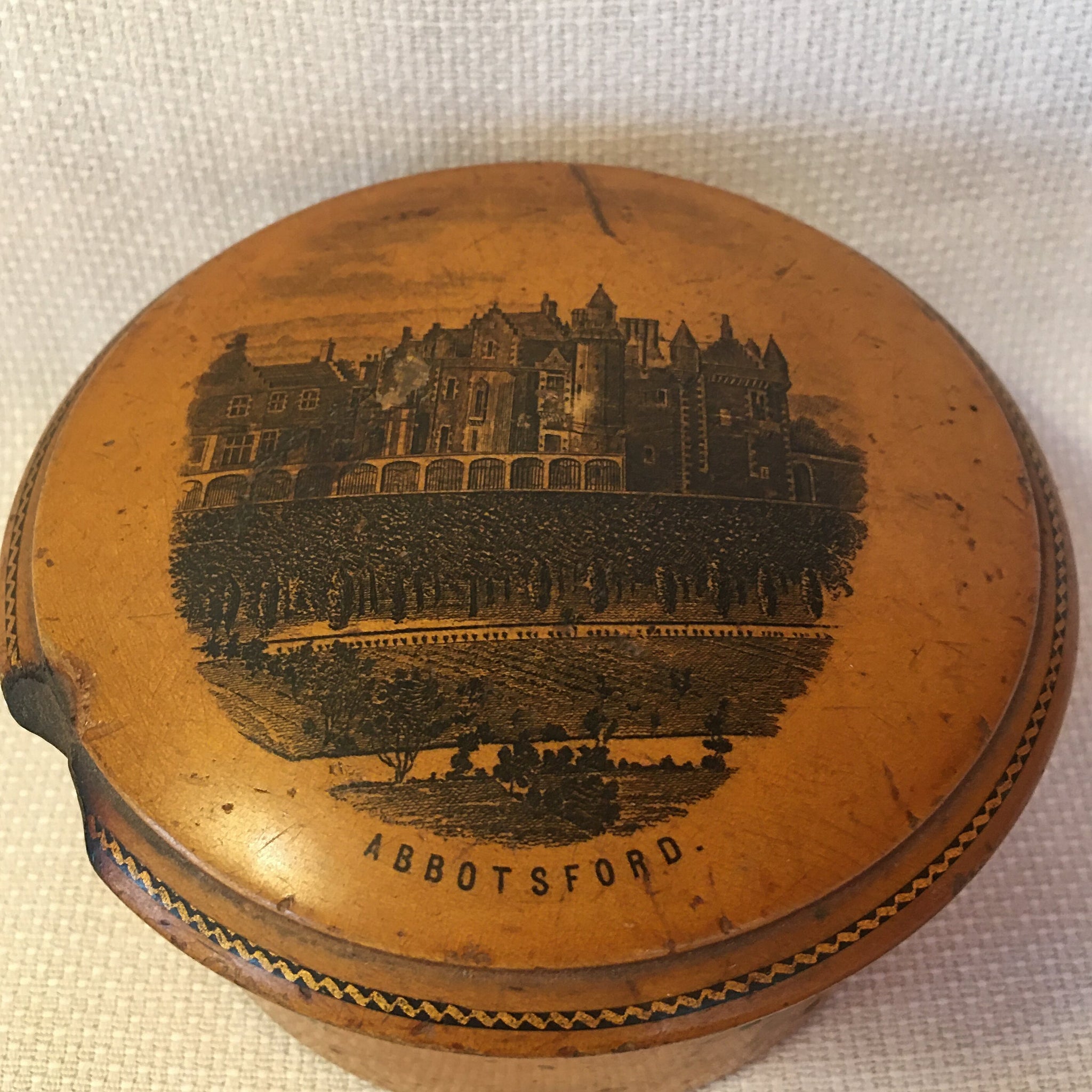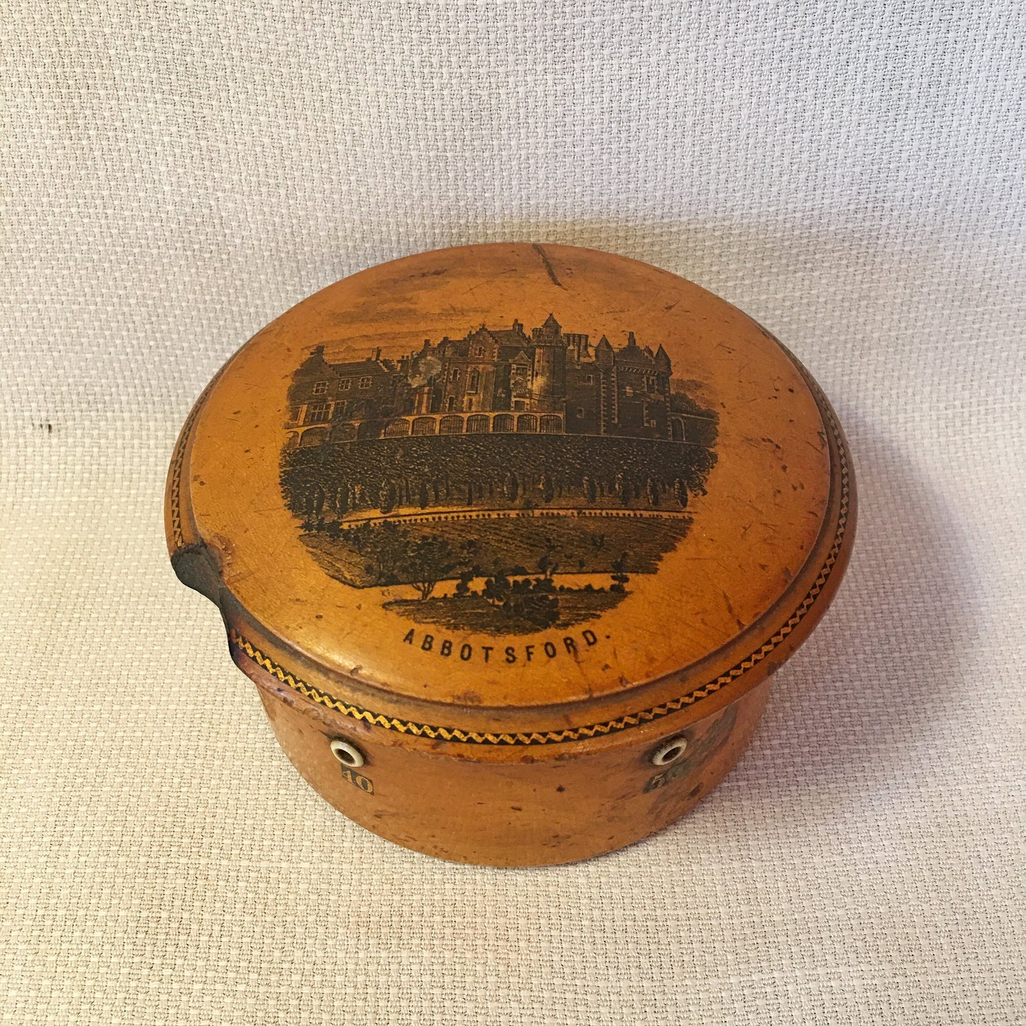 Late 1800's Mauchline ware spool holder featuring a transfer image of Abbotsford, the historic home of Sir Walter Scott in Scotland. The piece measures about 2" tall and 4" in diameter. It retains all of its bone eyelets, and the lid fits properly. Includes the wooden spools of thread. There is a place for a thimble in the middle.