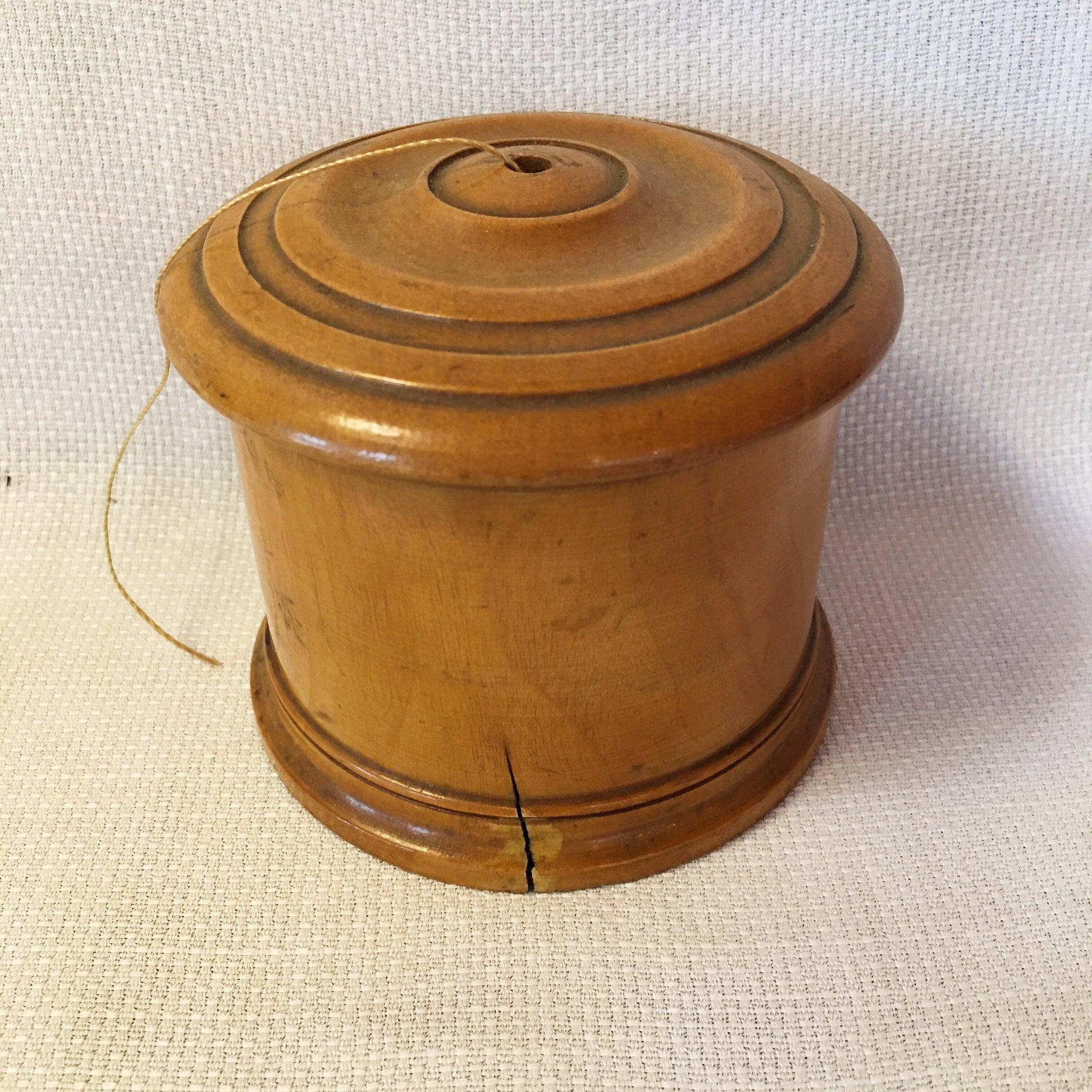 Late 1800's Mauchline ware string holder featuring a transfer image of Hastings Pier. The piece measures about 3" tall and 4" in diameter. It includes a wooden spool of knitting/crochet cotton inside. The top has an opening for feeding string or thread.