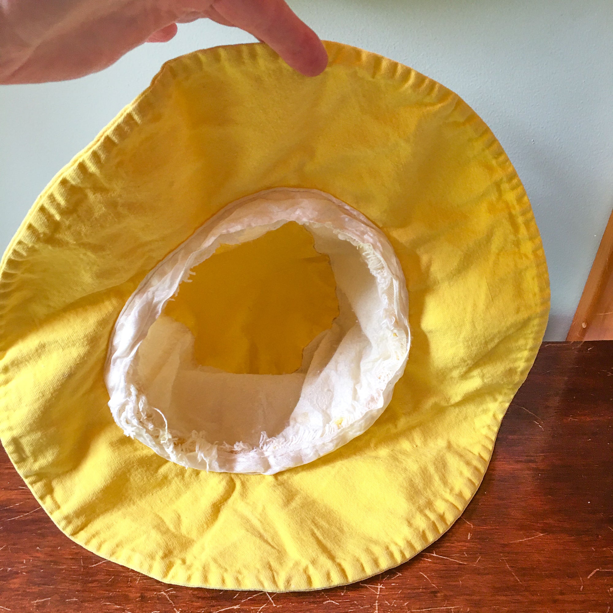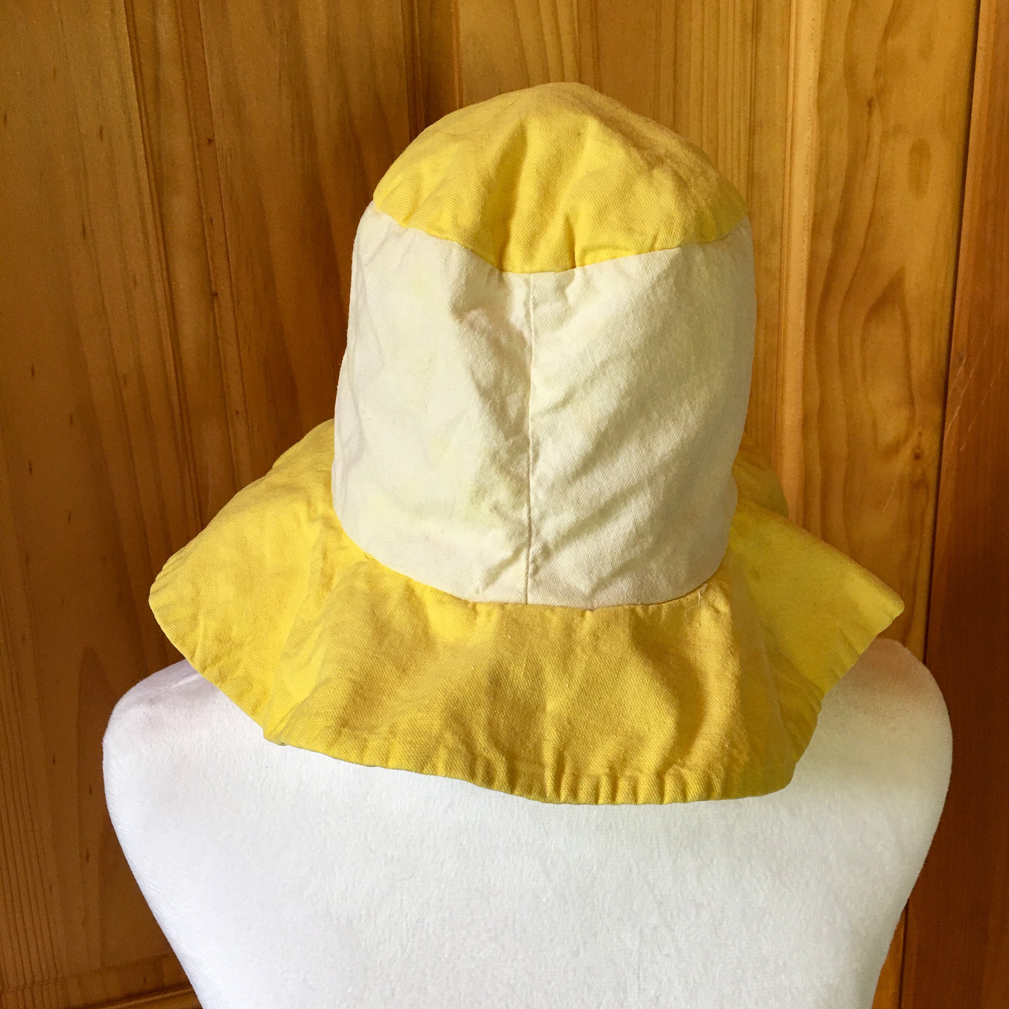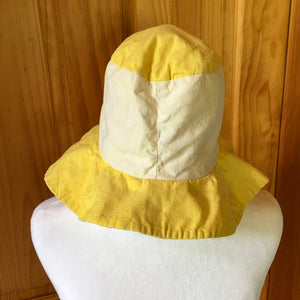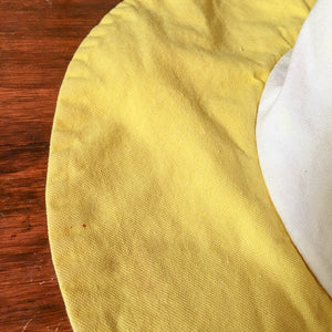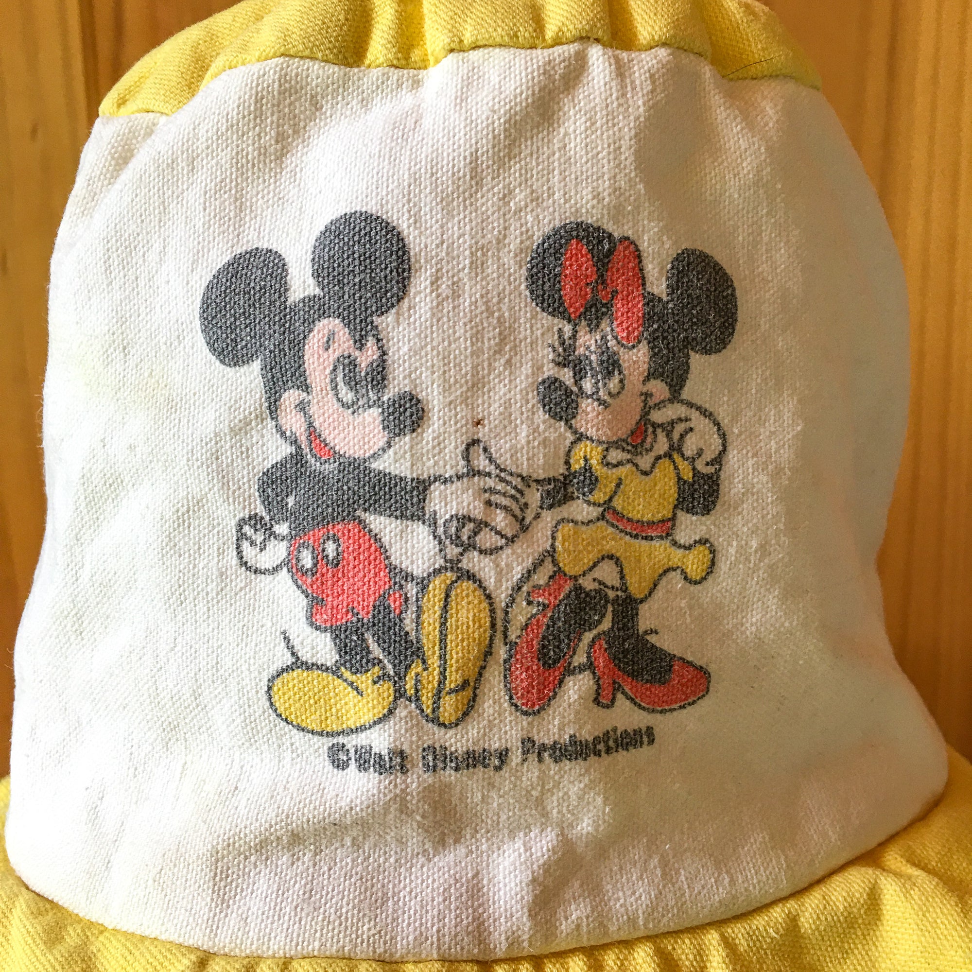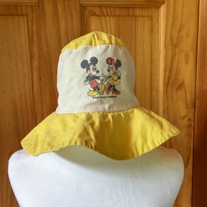 Adorable vintage children’s sun hat featuring Mickey and Minnie Mouse, marked © Walt Disney Productions—dating it to the late 1970s or early 1980s. Made from soft cotton in yellow and white with a floppy brim and wide crown. The print is lightly faded from wash and wear, and the yellow dye has gently bled into the white areas over time (not clearly visible in photos). One spot on the brim as shown, and the interior band is worn with signs of fraying. Approximate measurements: 13" across the brim, 7" across the inside band. A nostalgic collectible for vintage Disney lovers! Also, a unique baby shower gift or nursery decor!